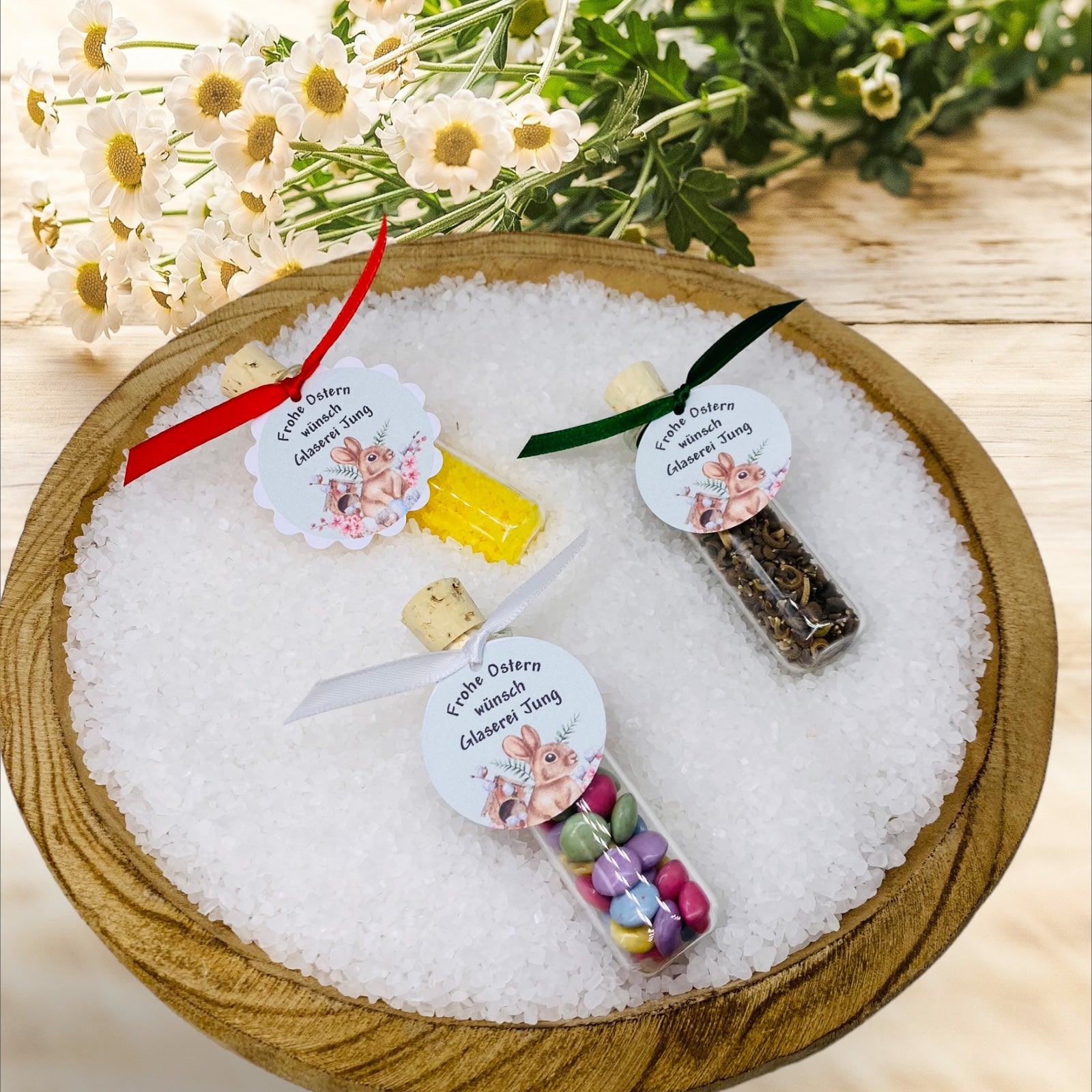 Schiffsgläschen als Ostergeschenk gefüllt mit verschiedenen Inhalte und Grafik