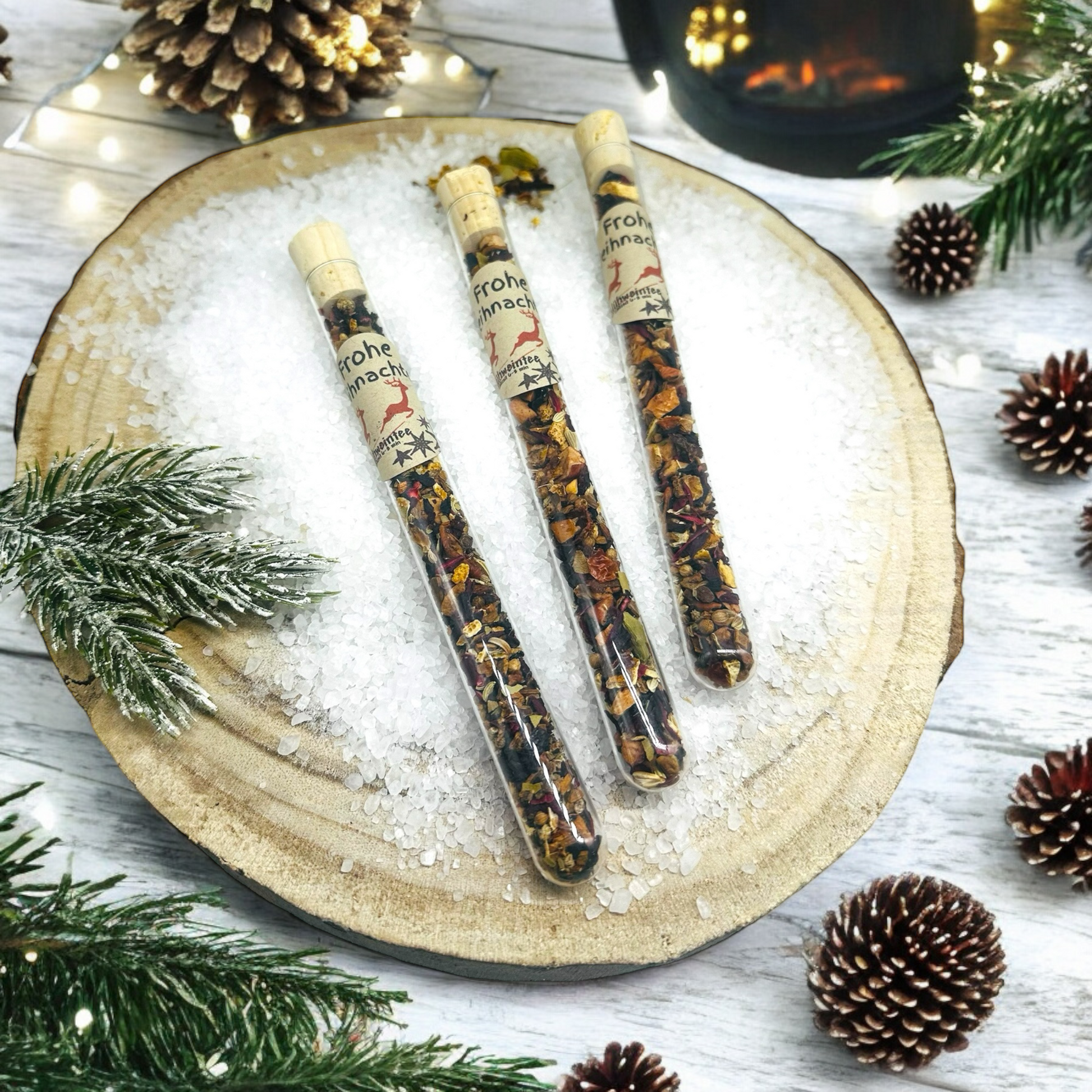 Verschenken Sie in diesem Jahr etwas ganz Besonderes: Ein Reagenzglas, gefüllt mit erlesenem Glühweintee, der den Duft und Geschmack von Weihnachten einfängt! Bedruckt mit festlichen Motiven und einer herzlichen „Frohe Weihnachten“-Botschaft, eignet sich dieses elegante Gastgeschenk perfekt für Familie, Freunde, Kollegen und Geschäftspartner.