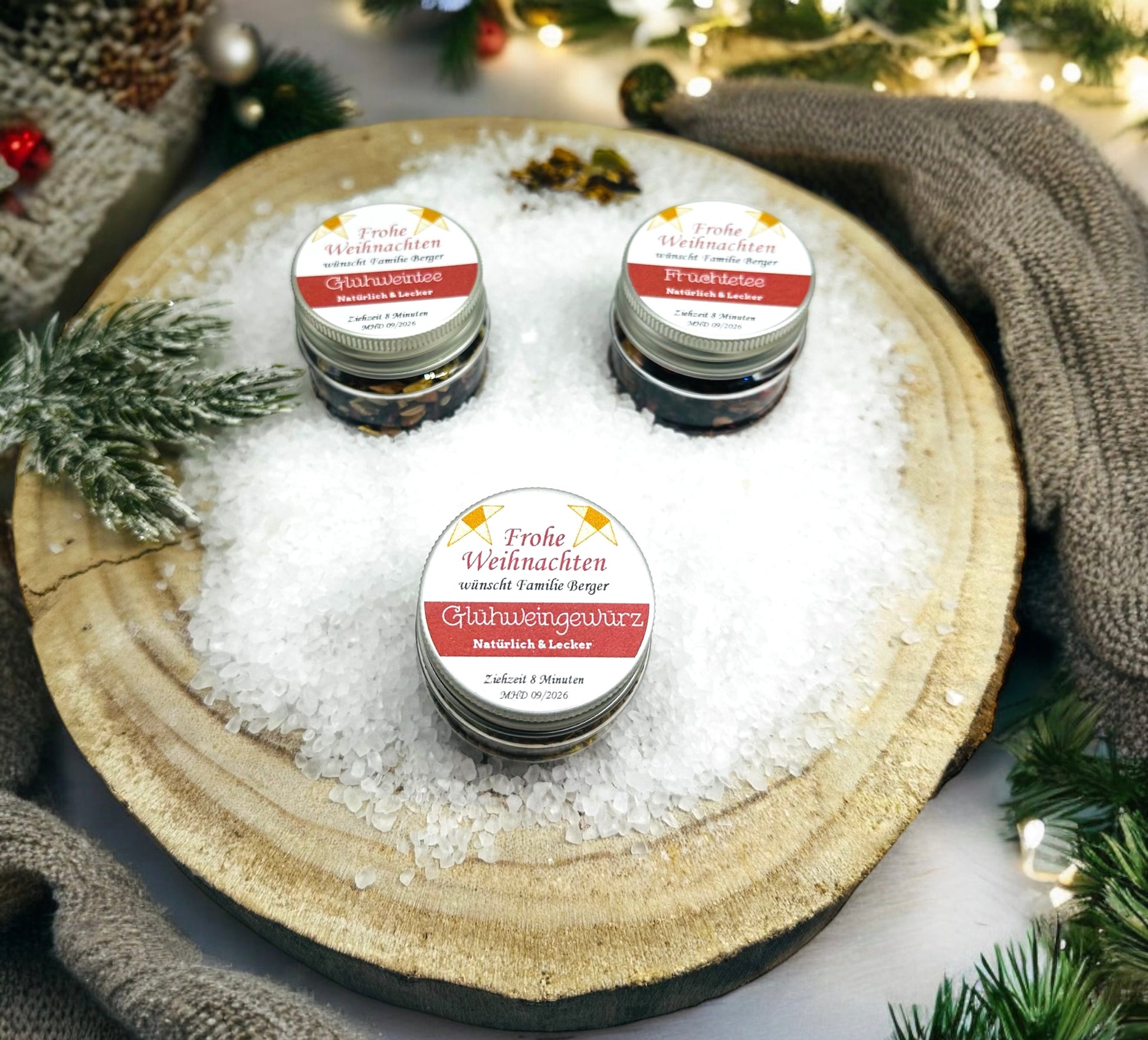 Weihnachtsgrüße als Döschen mit Glühweintee, Früchtetee oder Glühweingewürz
