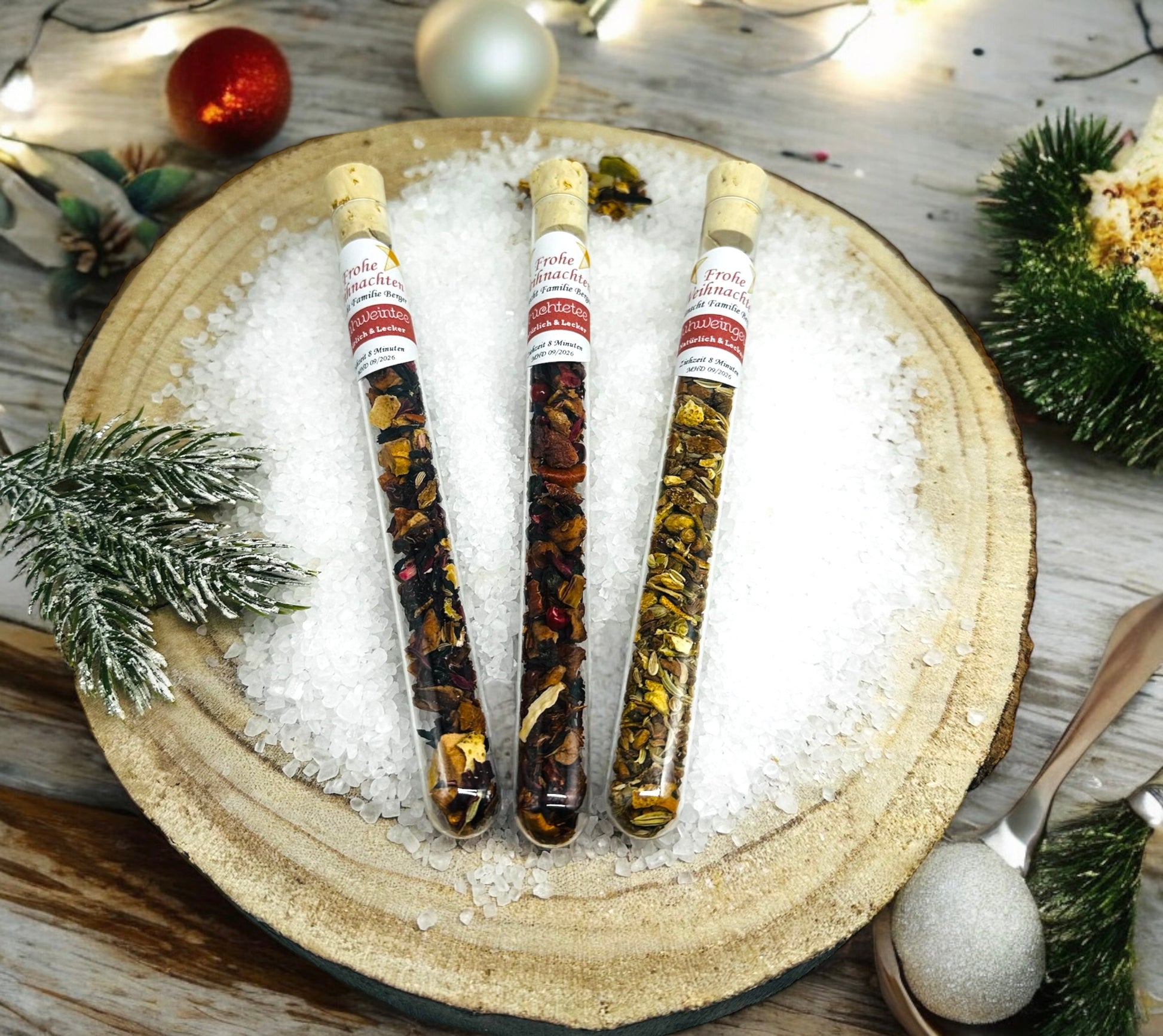 Verschenken Sie in diesem Jahr etwas ganz Besonderes: Ein Reagenzglas, gefüllt mit erlesenem Glühweintee, Früchtetee oder Glühweingewürz, der den Duft und Geschmack von Weihnachten einfängt! Bedruckt mit festlichen Motiven und einer herzlichen „Frohe Weihnachten“-Botschaft, eignet sich dieses elegante Gastgeschenk perfekt für Familie, Freunde, Kollegen und Geschäftspartner.