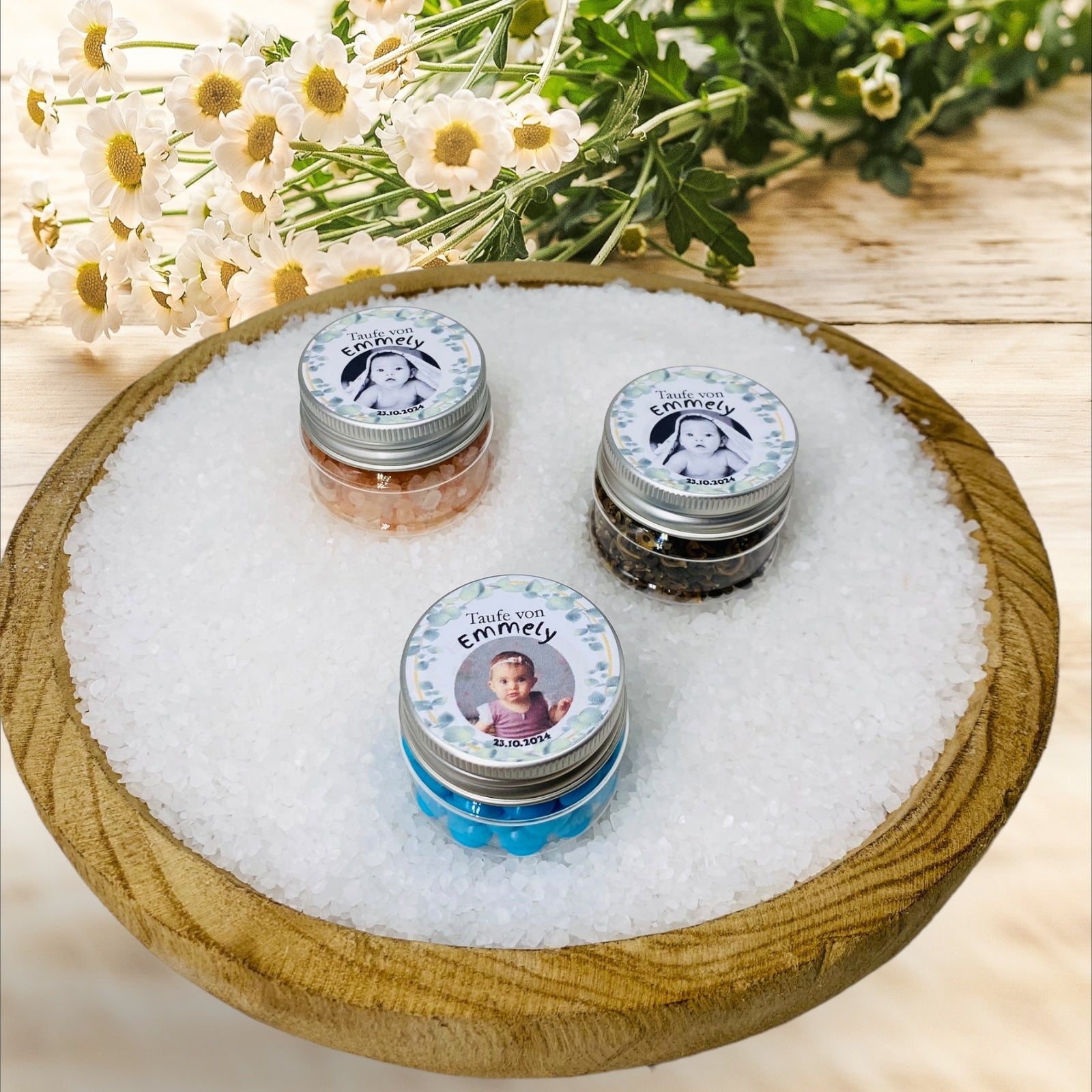Der bedruckte Deckel des Tiegels trägt ein zartes Muster von Eukalyptusblättern und wird mit den Worten "Taufe von" geschmückt. Hier kommt die wahre Magie: Der Name des Täuflings und das Datum der Taufe können ebenfalls auf dem Deckel personalisiert werden. Doch das Highlight dieses besonderen Gastgeschenks liegt darin, dass der Kunde die Möglichkeit hat, ein Foto seines kleinen Engels zu schicken. Dieses Foto wird liebevoll auf den Deckel aufgedruckt und macht das Gastgeschenk zu einer bleibenden Erinnerung.
