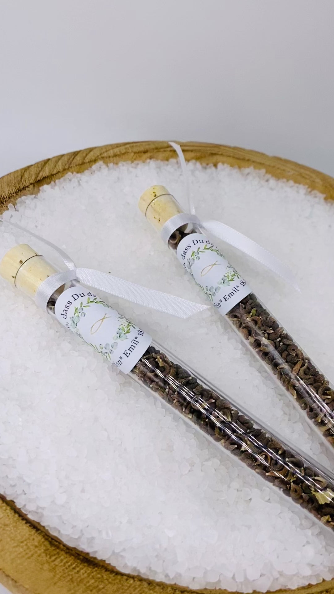 - **Naturlig elegance:** Reagensglasset, der måler 160 mm x 16 mm, er lukket med en autentisk korkprop og dekoreret med et smukt hvidt satinbånd. En gæstegave, der kombinerer naturlighed og elegance.