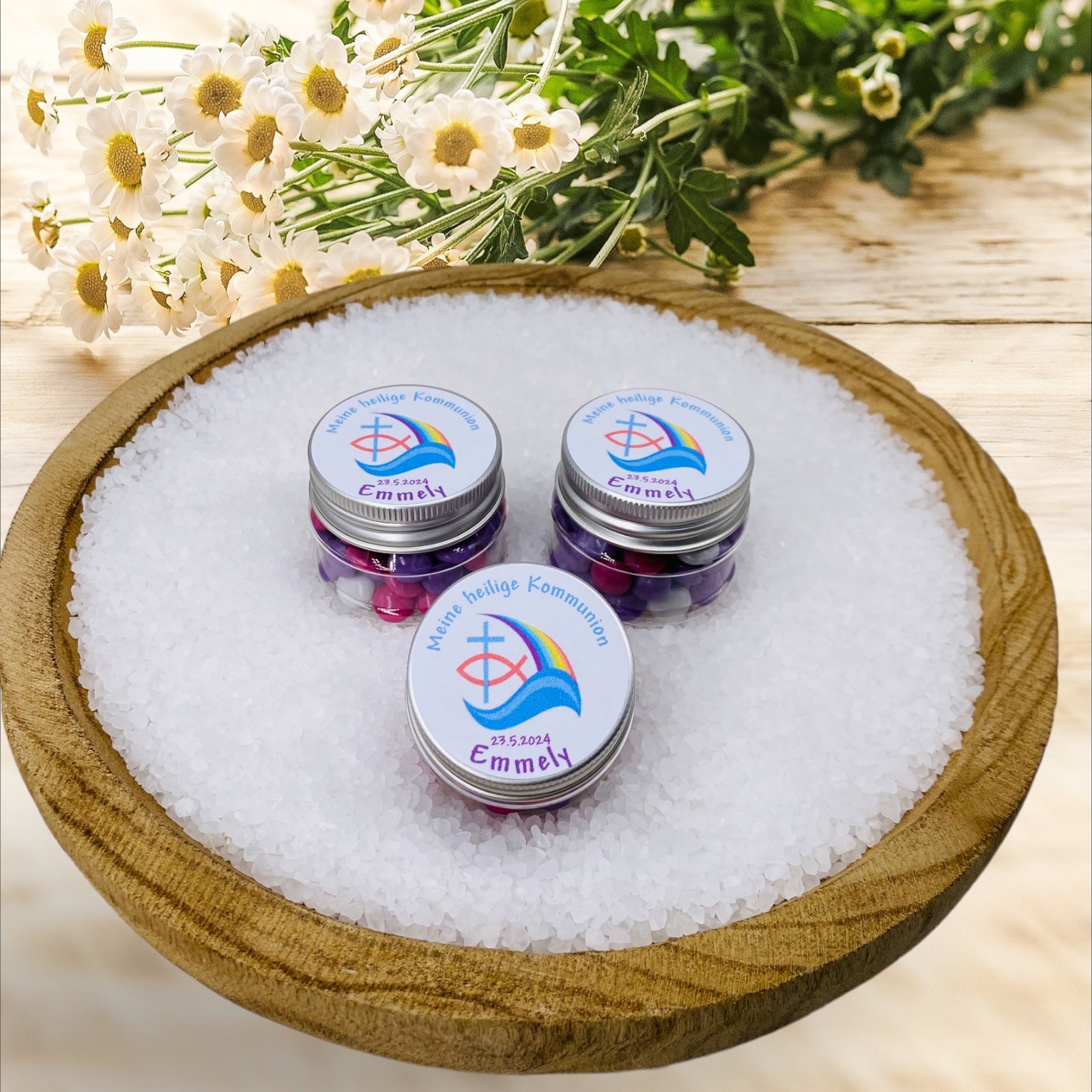 3. **Personliggørelse:** Gør gæstegaven til noget særligt. Det trykte låg kan personliggøres med navn og dato. Grafik som en regnbue, et skib med et kirkekors og søde fisk i pastelfarver.