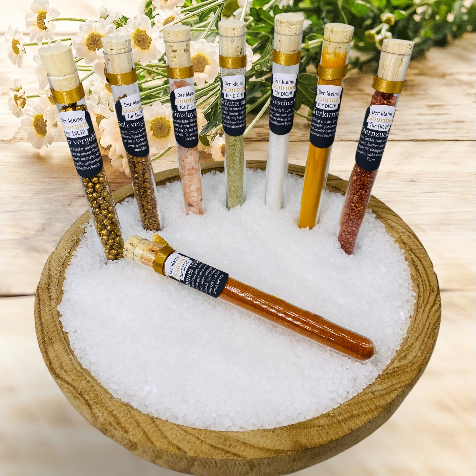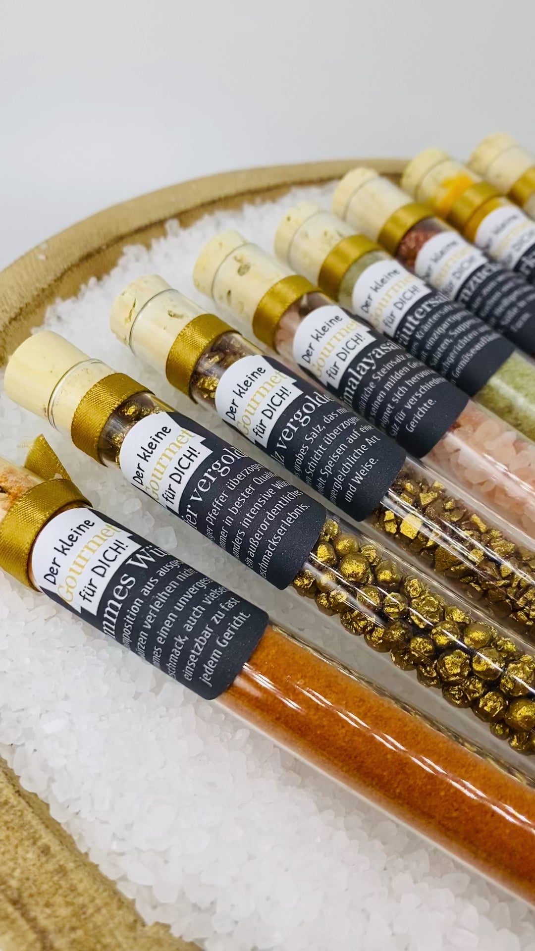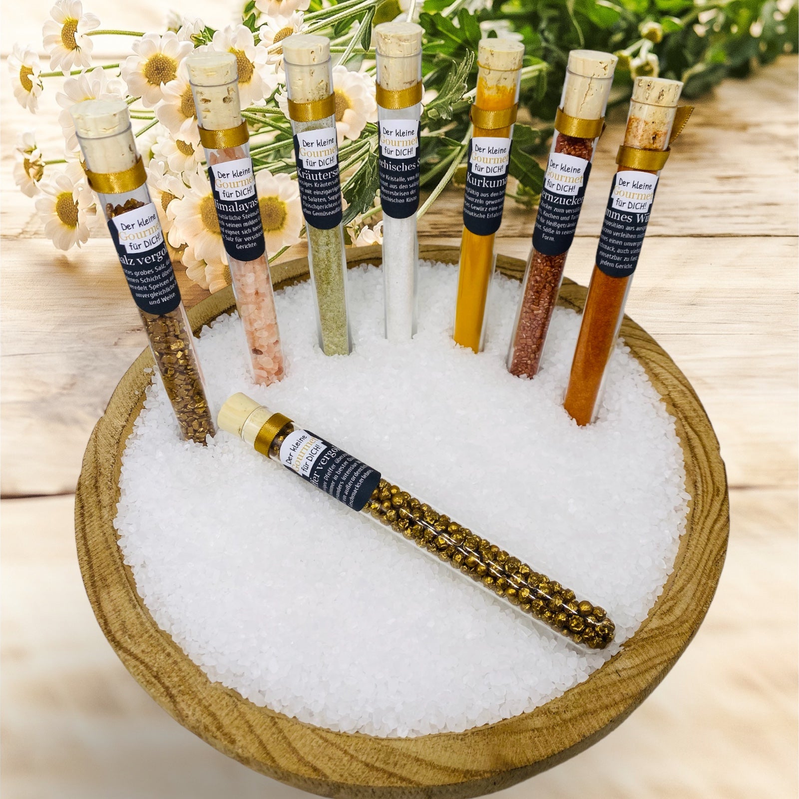 Hvert reagensglas er dekoreret med et guldsatinbånd for at understrege elegance.