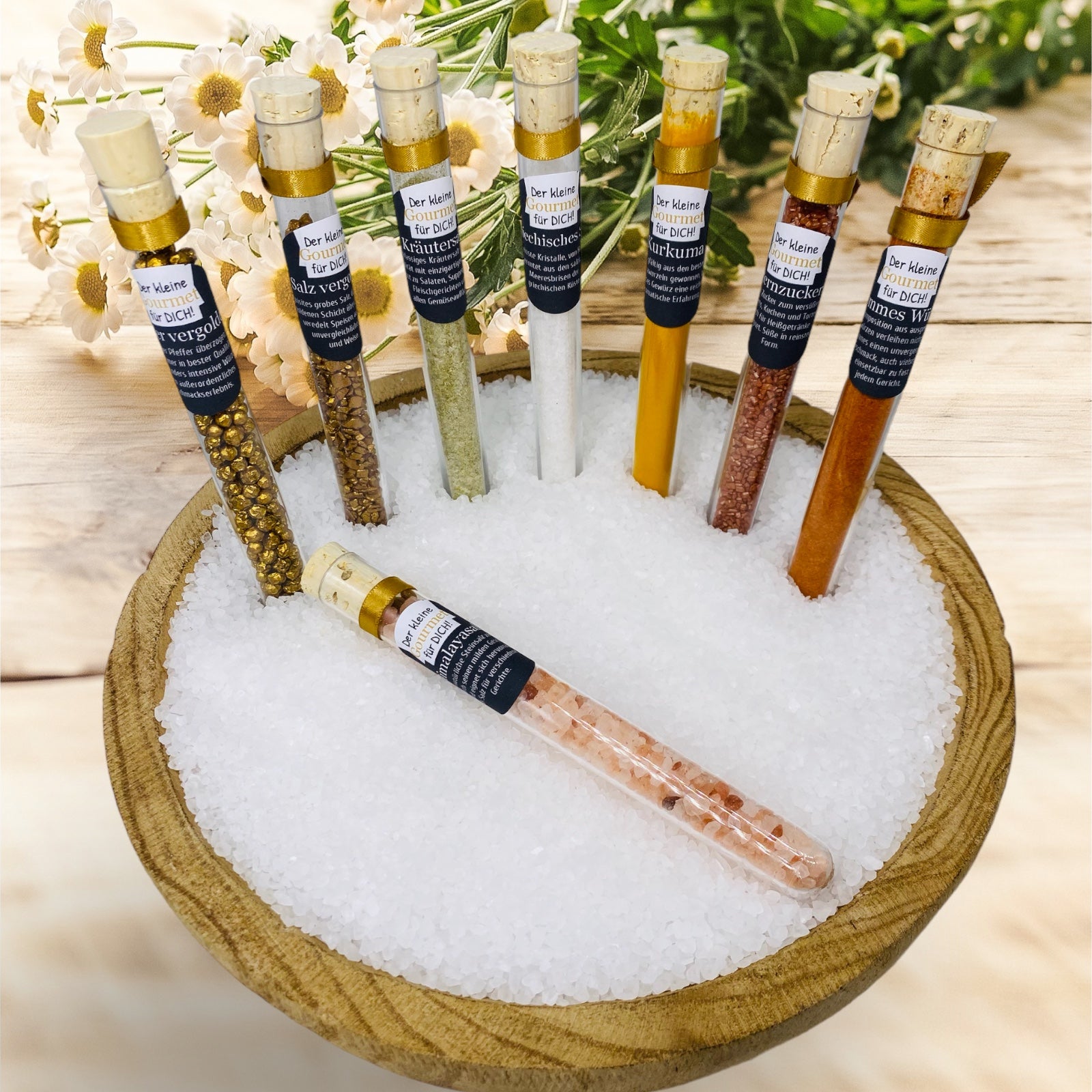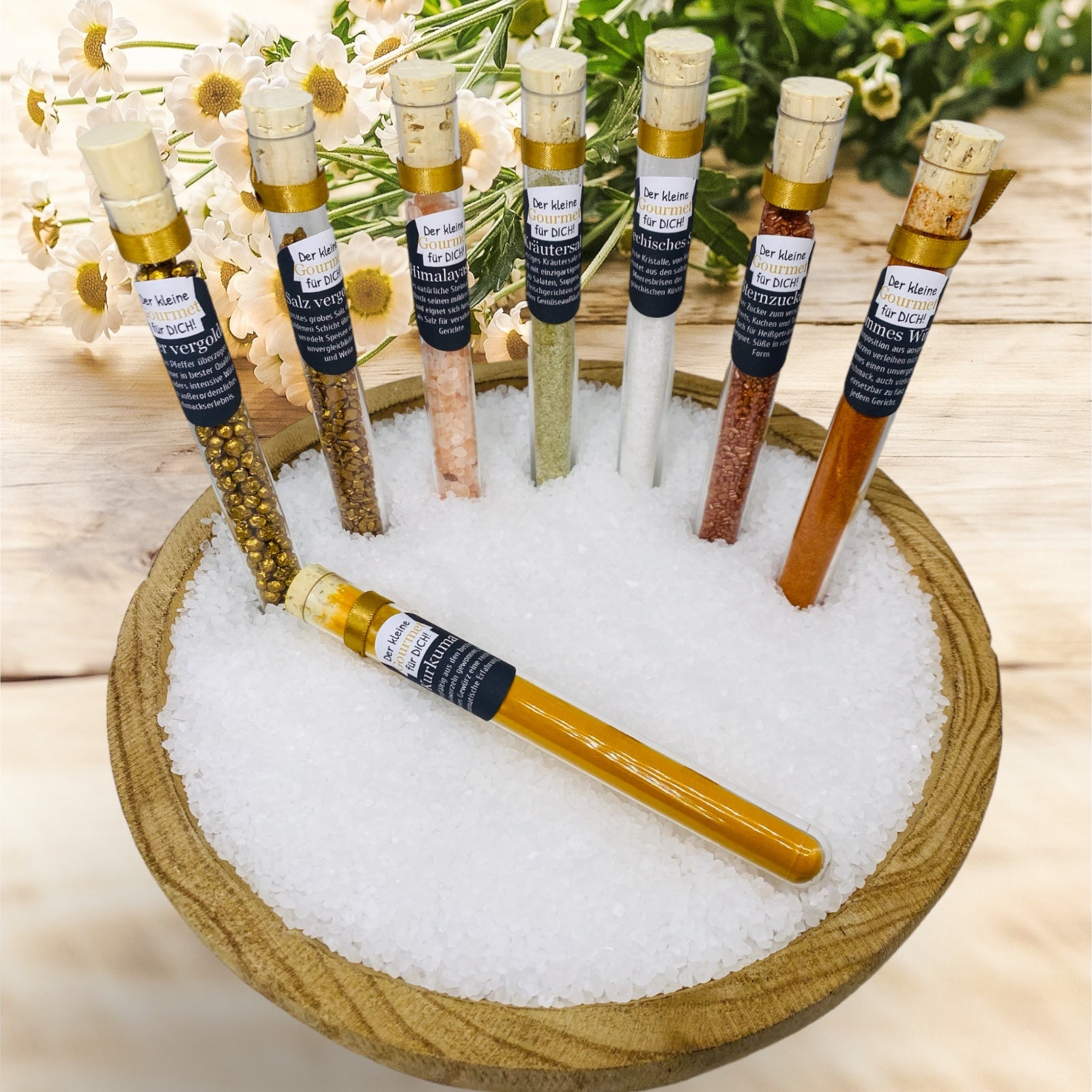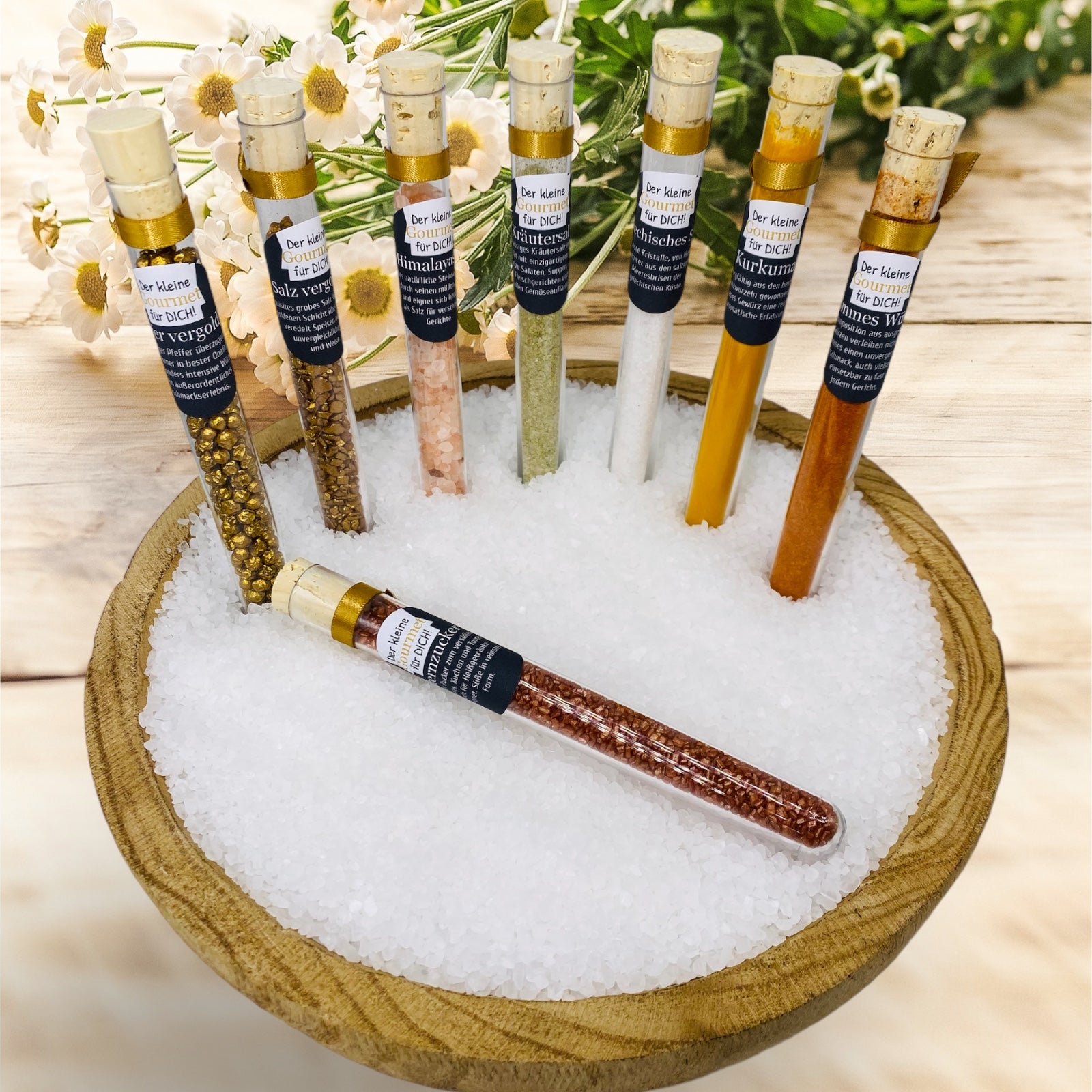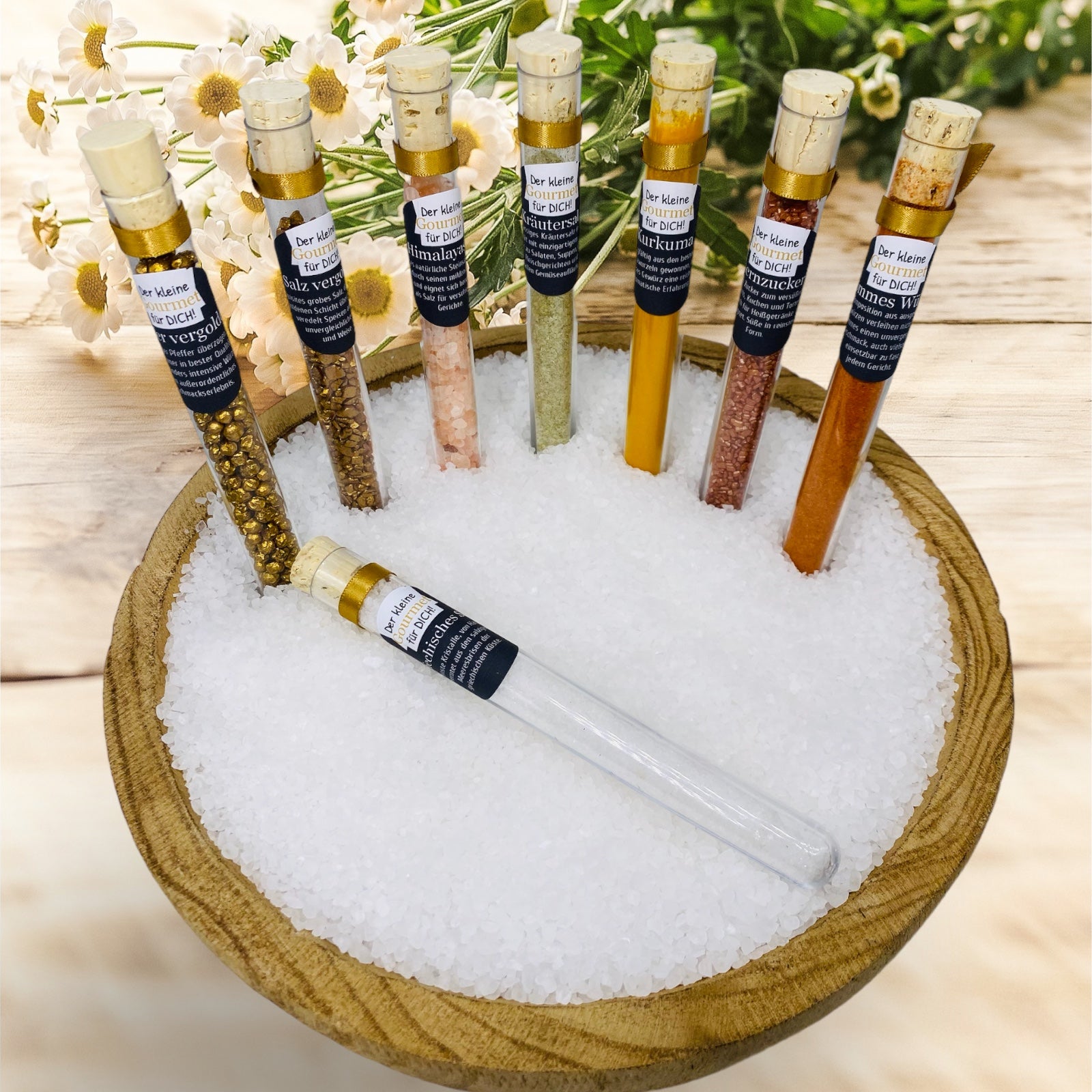 Hvert reagensglas er dekoreret med et guldsatinbånd for at understrege elegance.