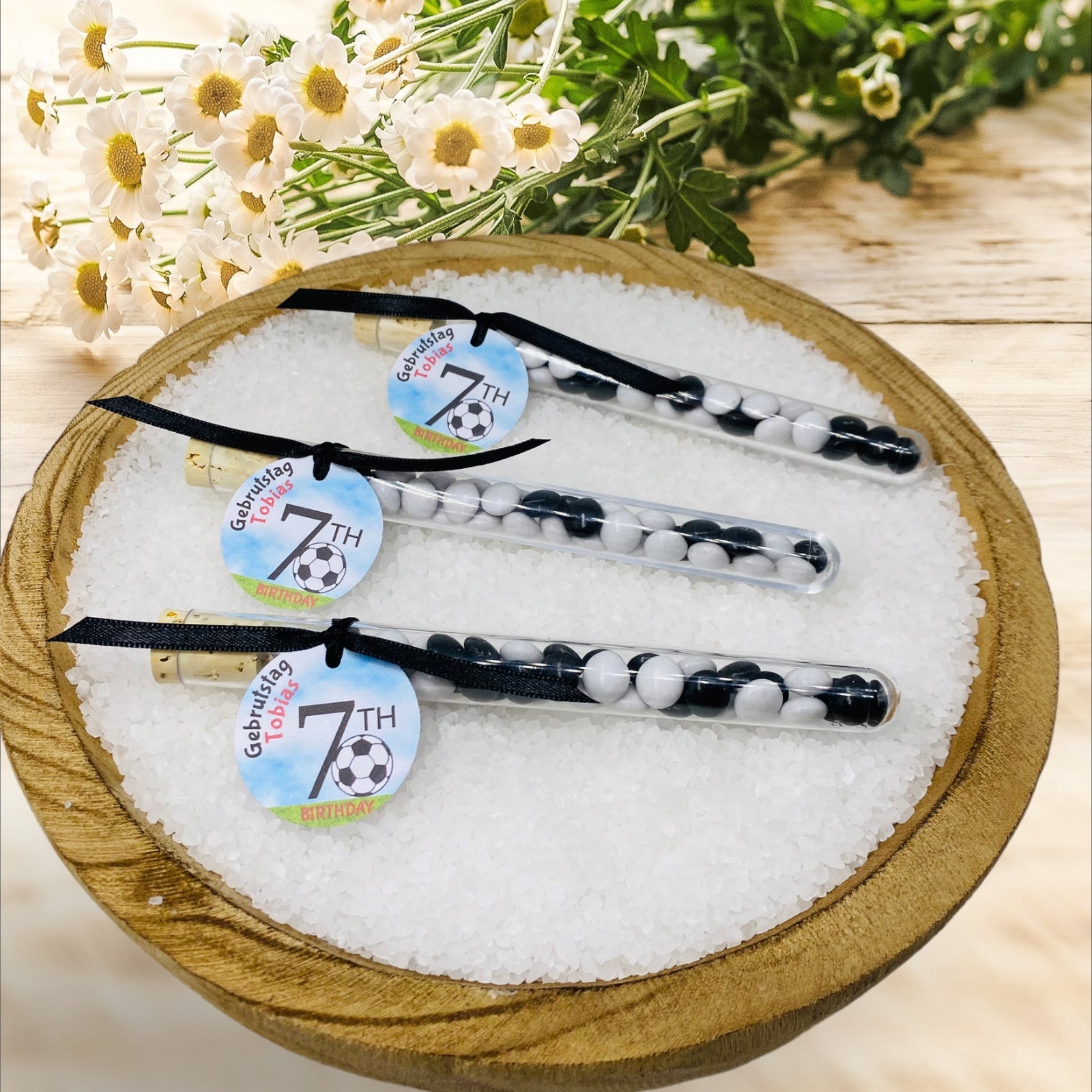 Oplev den perfekte gæstegave til den fodboldglade børnefødselsdag - vores unikke reagensglas fyldt med lækre chokoladeknapper lavet af delikat sødmælk!