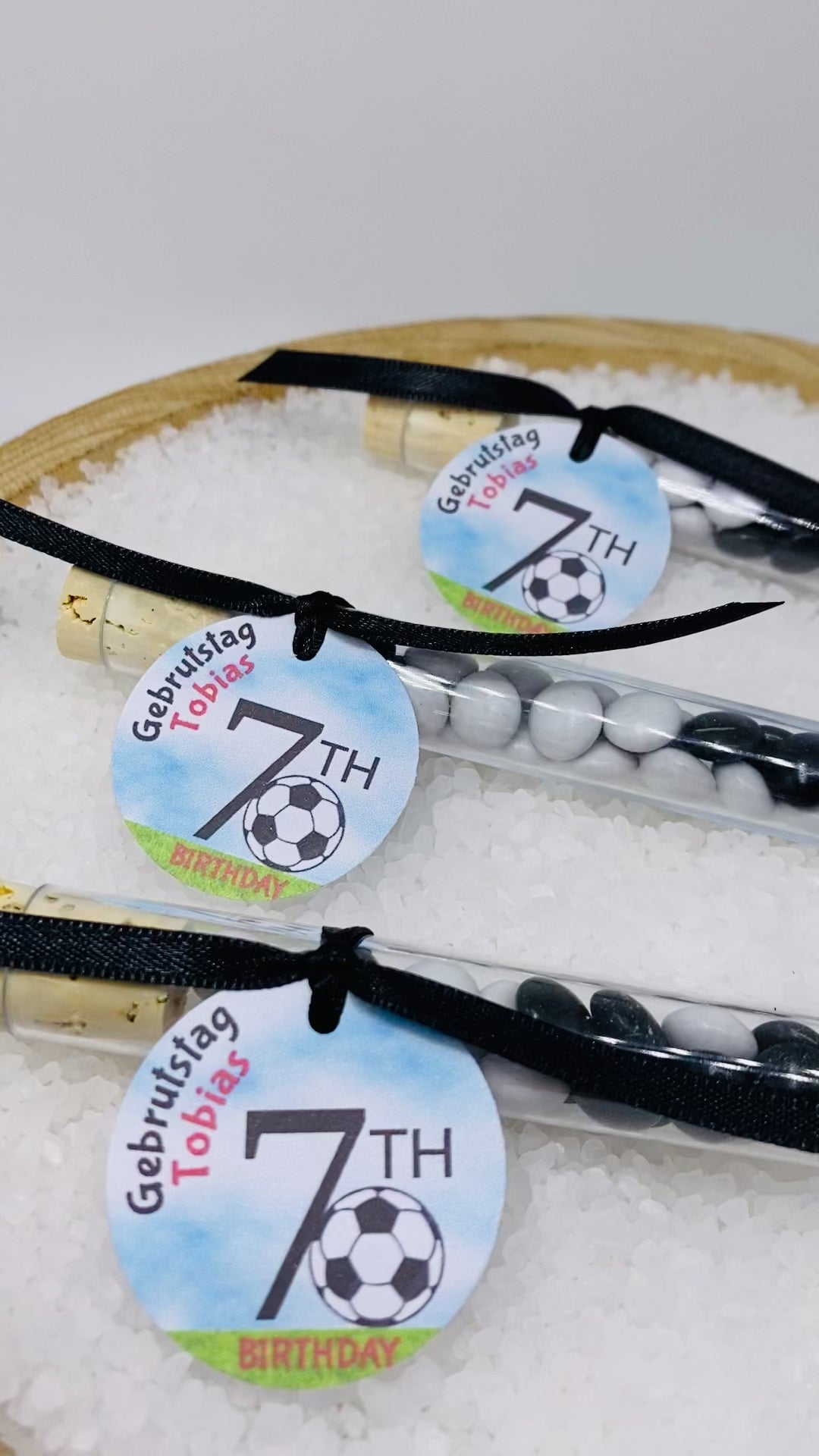 Vores kærligt designede gæstegaver er et rigtigt blikfang. Reagensglasset har en praktisk størrelse på 160 mm x 16 mm, og farven er perfekt koordineret med "fodbold"-temaet. Den har en løkke, som et vedhæng er fastgjort til. Den lille fodboldfans fødselsdag og hans navn er personligt trykt på dette vedhæng. En stilfuld fodbold omgivet af frodigt græs fuldender designet perfekt.