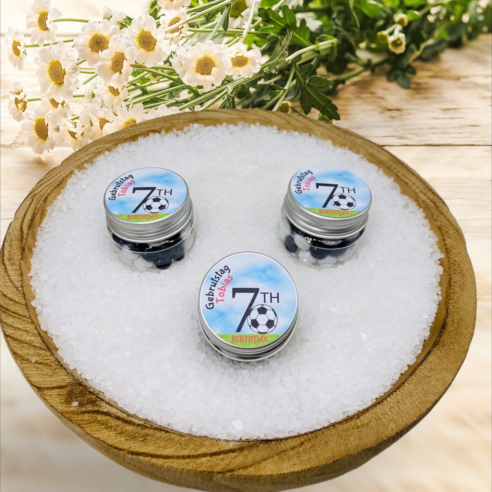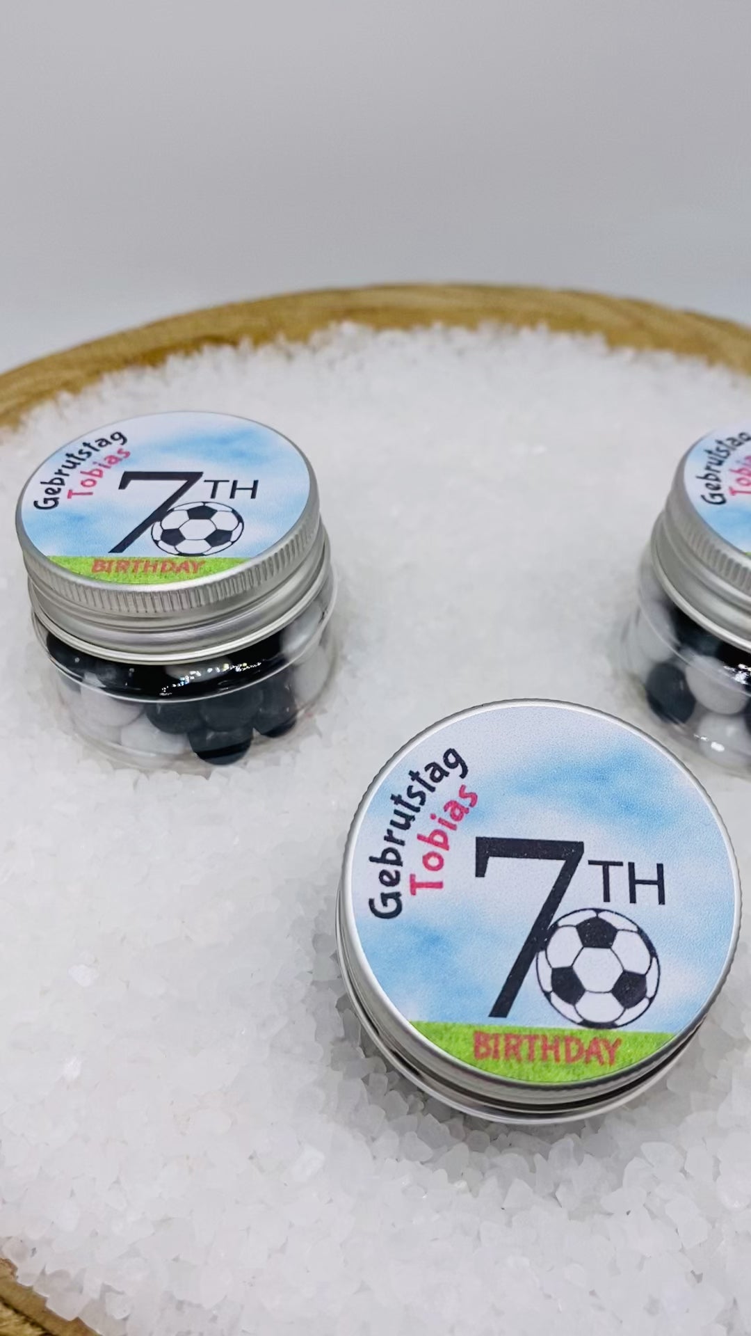 Vores kærligt designede gæstegaver er et rigtigt blikfang. Krukken har en praktisk størrelse på 43 mm x 38 mm, og farven er perfekt koordineret med "fodbold"-temaet. Den lille fodboldfans fødselsdag og hans navn er personligt trykt på dette låg. En stilfuld fodbold omgivet af frodigt græs fuldender designet perfekt.