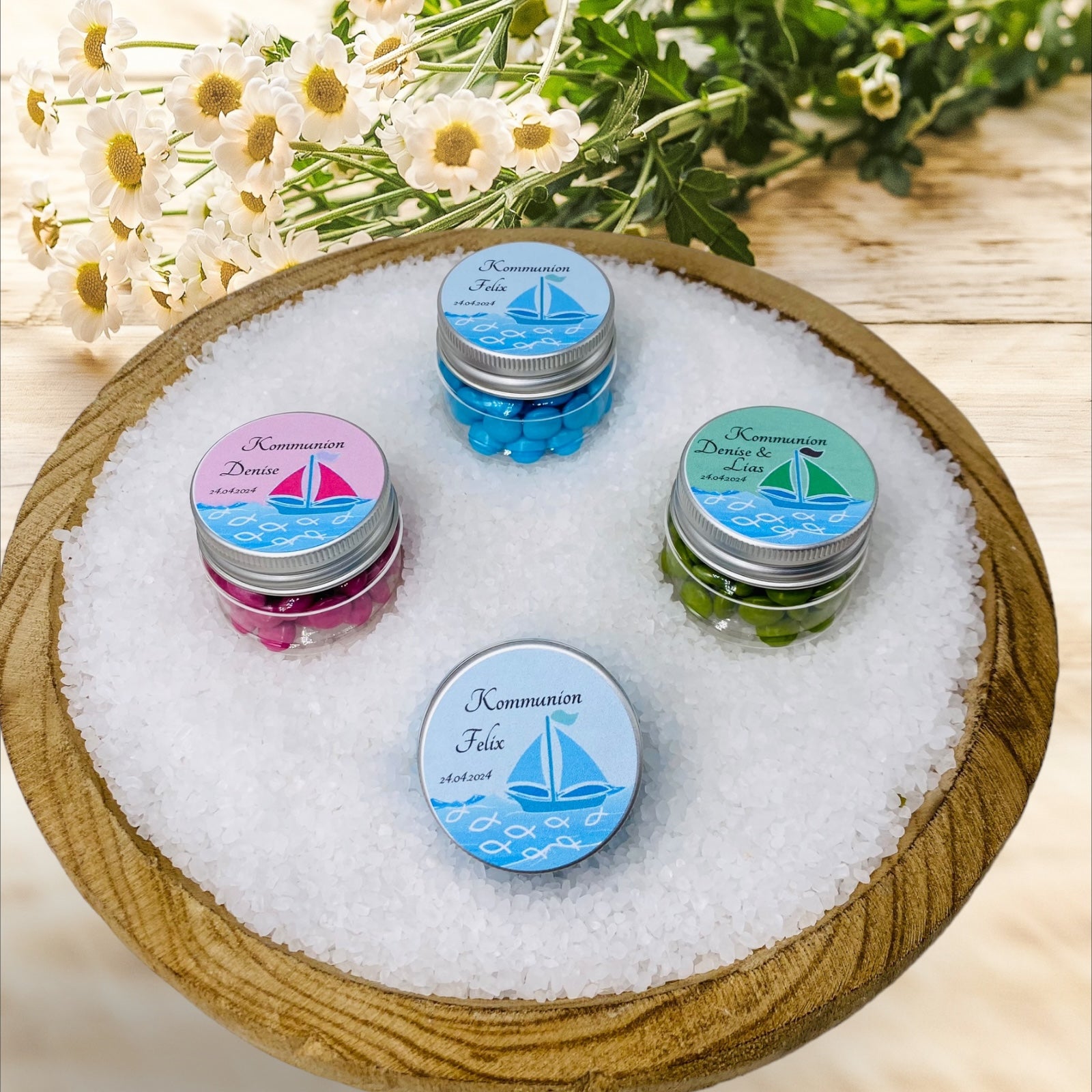 Präsentieren Sie mit unserem exklusiven Gastgeschenk in Form eines Tiegels ein einzigartiges Erlebnis für besondere Anlässe wie Kommunion, Konfirmation oder Taufe. Das Döschen, mit einer Größe von 43 × 38 mm, ist nicht nur ein Blickfang, sondern auch gefüllt mit freudig bunten Schokolinsen, die sorgfältig in Einzelfarben farblich abgestimmt sind.