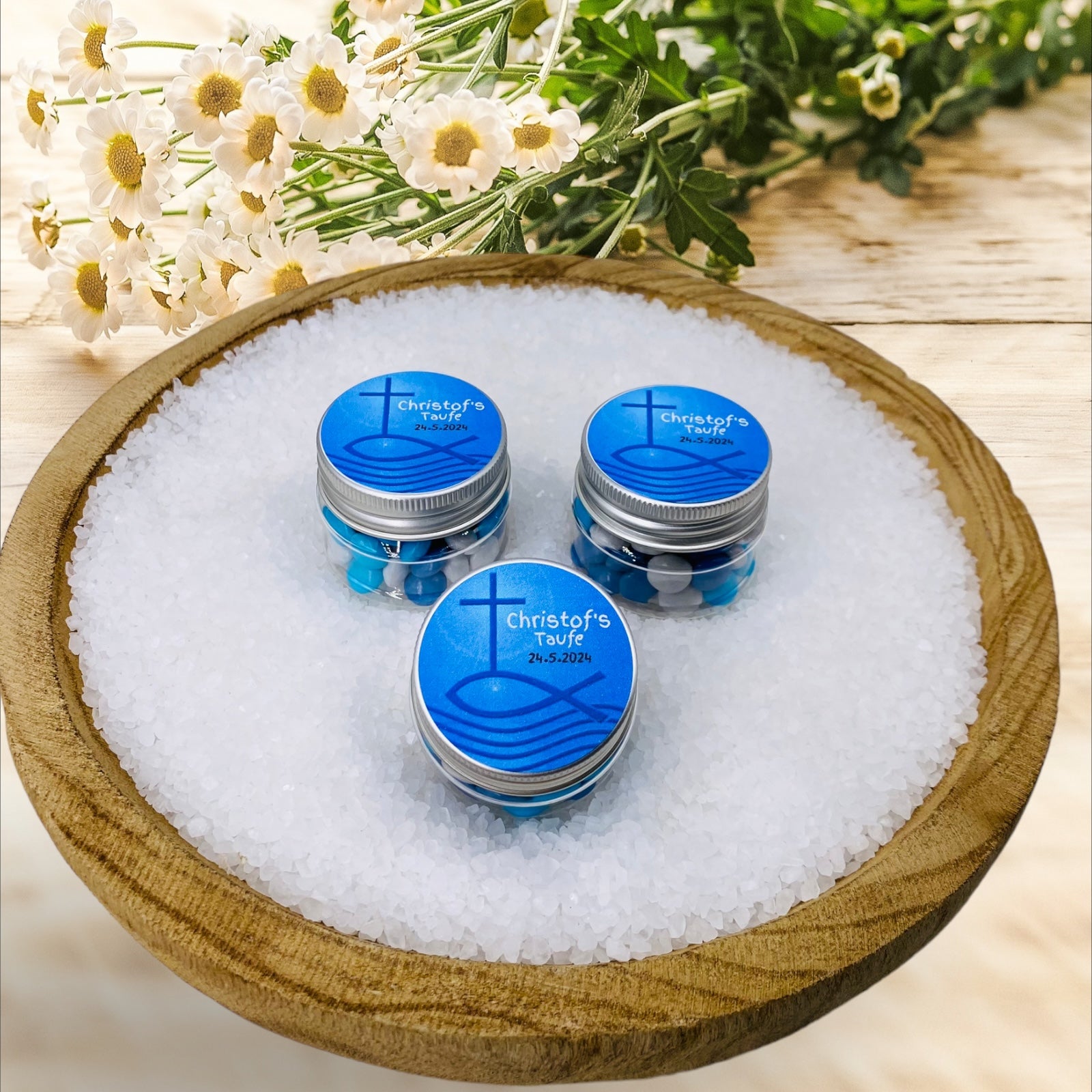 Fordyb dig i den magiske atmosfære af dåb, nadver, konfirmation eller konfirmation med vores unikke gæstegaver. Præsenteret i en elegant krukke (43 mm x 38 mm), tilbyder vi dig en omhyggeligt sammensat blanding af chokoladeknapper i de beroligende farver blå, hvid og turkis. Disse små delikatesser er ikke kun en sød fristelse, men også en kærlig påmindelse om den særlige lejlighed.