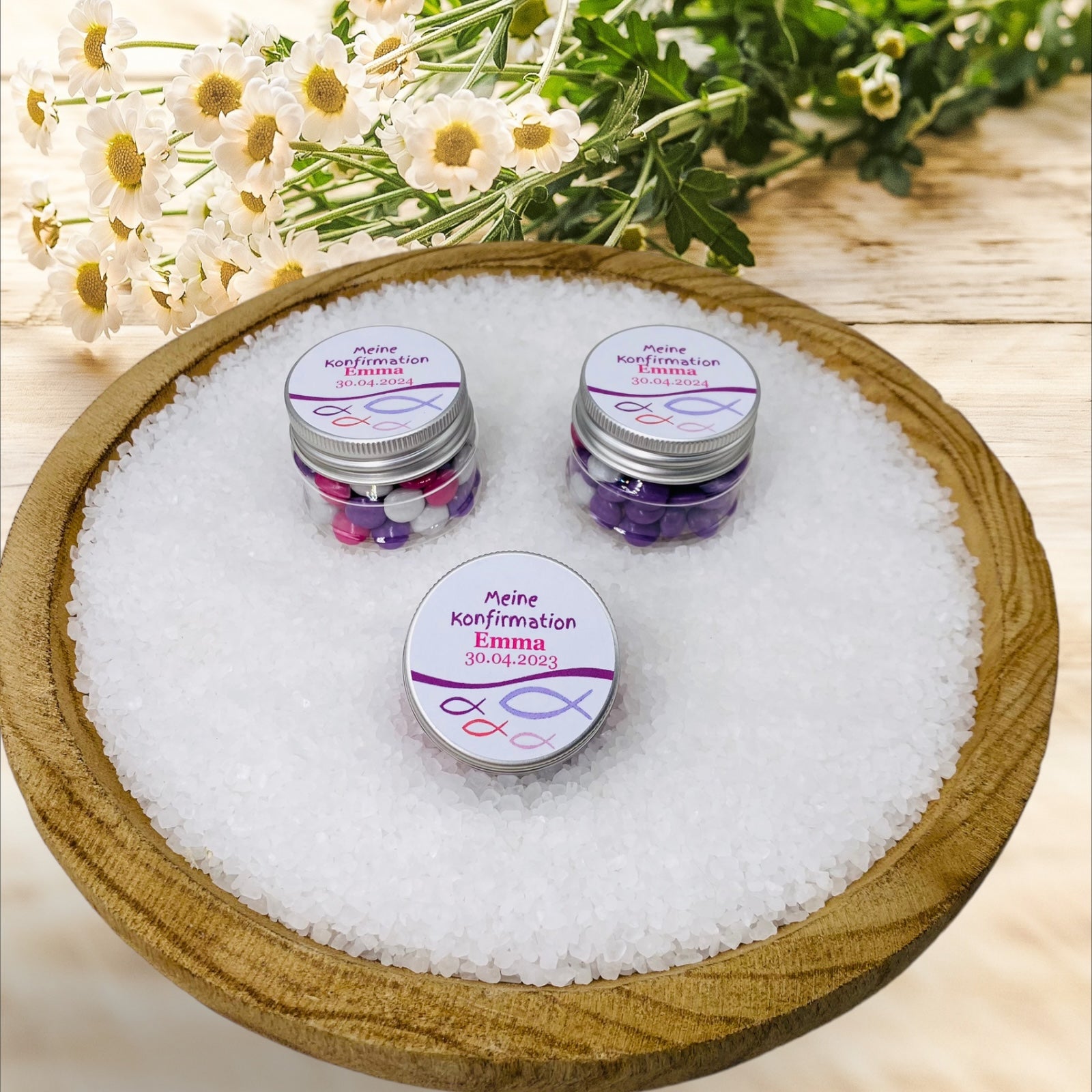 5. **Personlig print:** Udtrykkets midtpunkt er den personlige inskription "Min konfirmation (Konfirmation/Dåb/Bekræftelse kan ændres)", ledsaget af barnets navn og betydningsfulde dato.