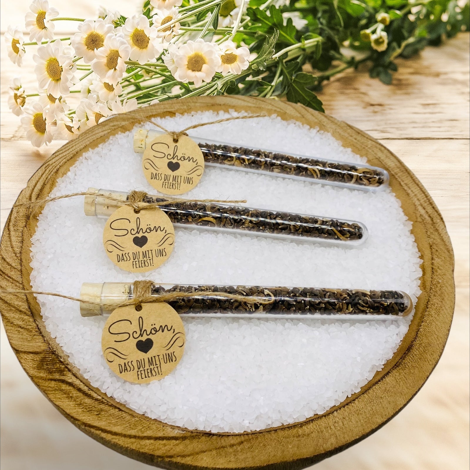 Entdecken Sie ein Gastgeschenk in den Maßen 160 x 16 mm, gefüllt mit einer einzigartigen Mischung aus Blumensamen. Jedes Gastgeschenk trägt die Hoffnung auf wachsende Freundschaft und positive Erinnerungen.