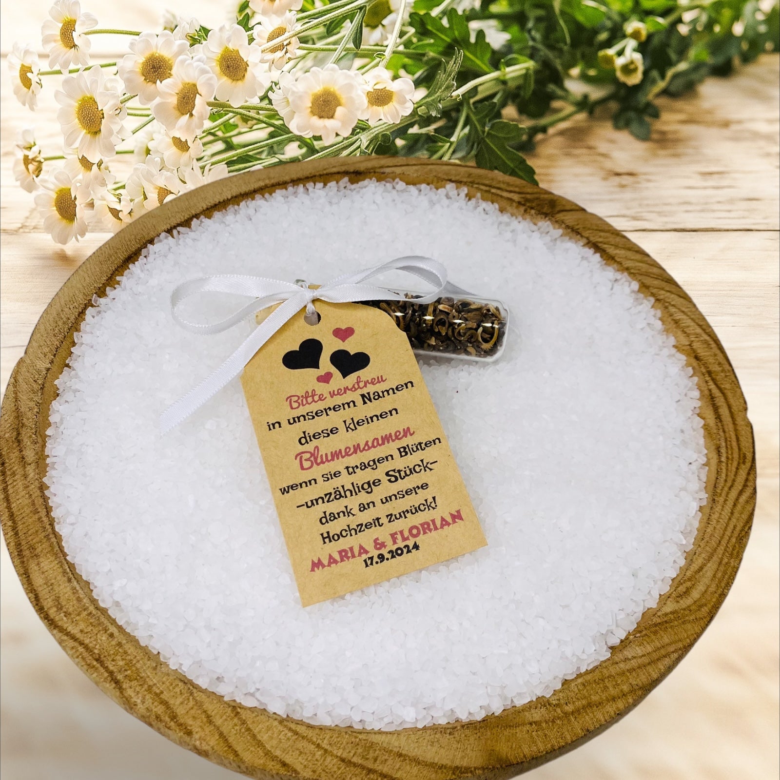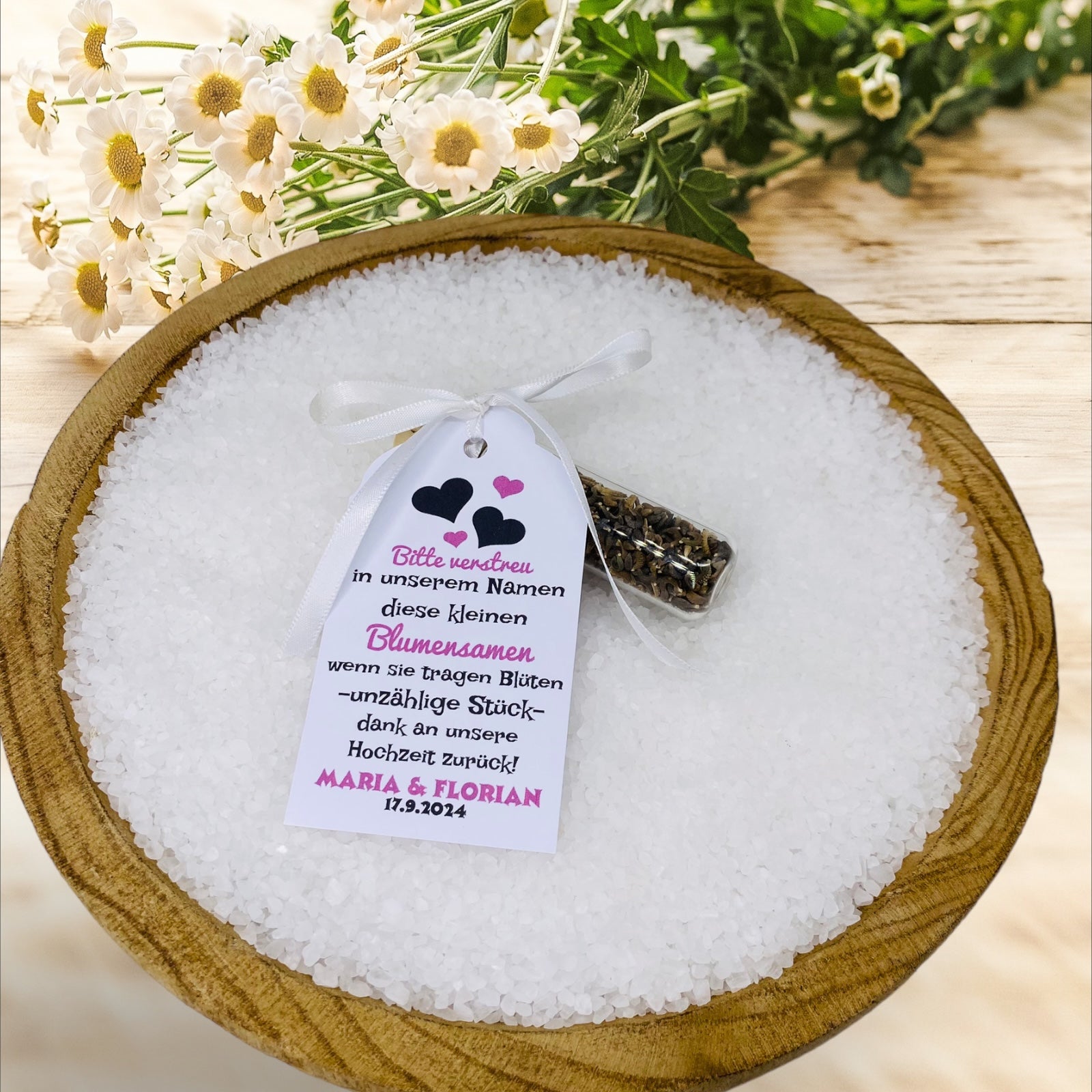 - **Großzügig geformter Anhänger:** Ein individuell geformter Anhänger schmückt das Band und trägt die bedeutungsvolle Inschrift: "Bitte verstreue in meinem Namen diese kleinen Blumensamen, die, wenn sie tragen Blüten, unzählige Stück, denk an meine/n ++Anlass++ zurück"