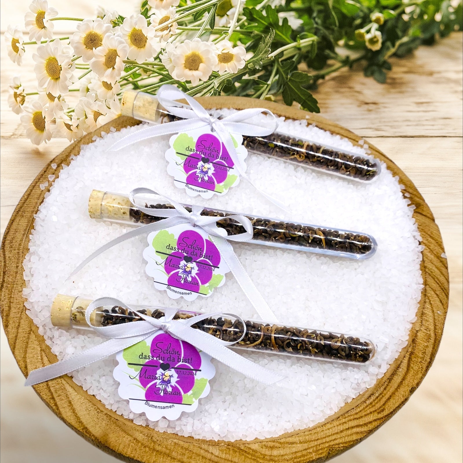 Überraschen Sie Ihre Gäste mit einem zauberhaften Gastgeschenk, das für bleibende Erinnerungen sorgt. Unser Reagenzglas-Geschenk ist gefüllt mit bunten Blumensamen, symbolisierend die Liebe, die wächst. Dekoriert mit einem individuell ausgewählten Satinband in verschiedenen Farben und verschlossen mit einem echten Korken, verleiht dieses einzigartige Präsent Ihrer Feier einen besonderen Charme.