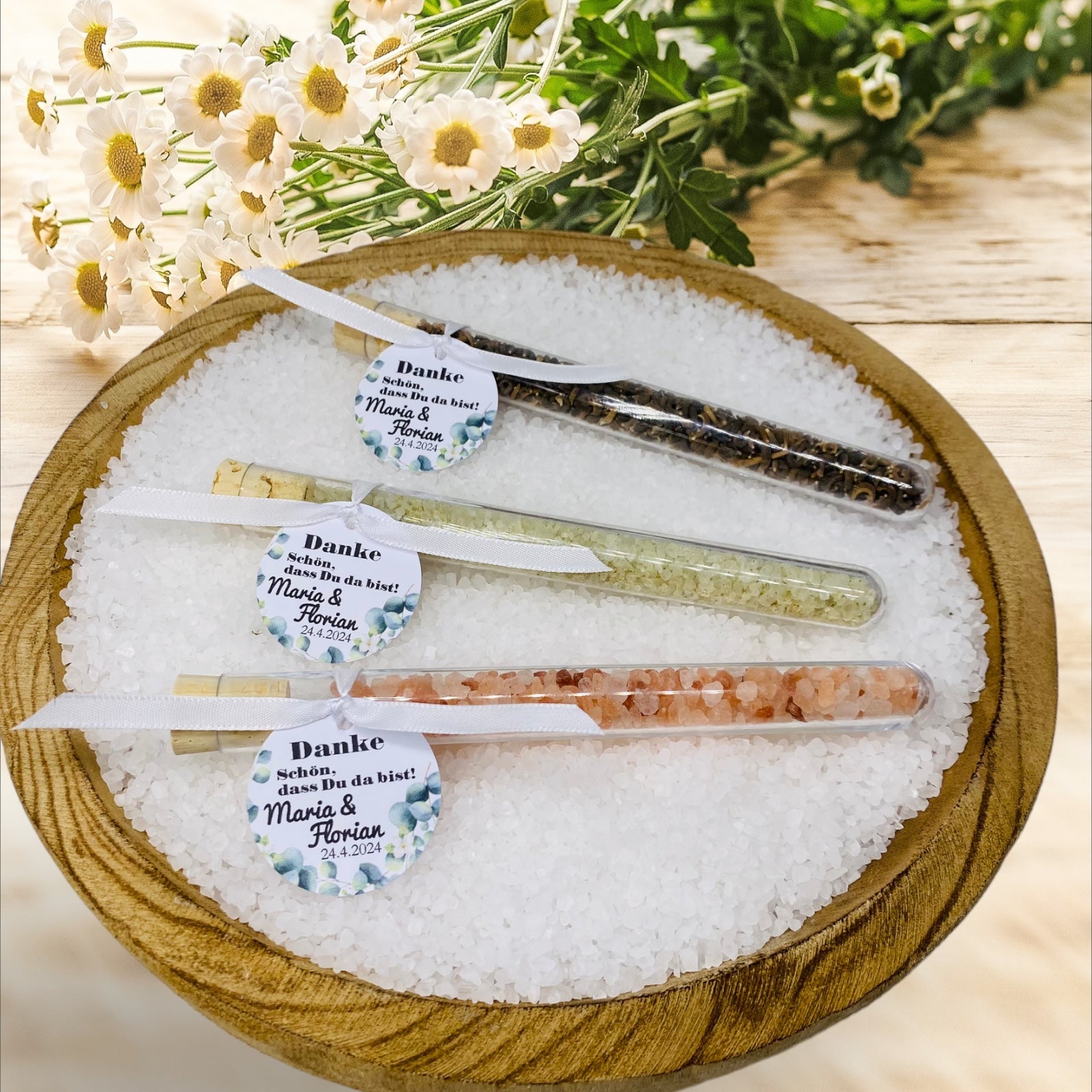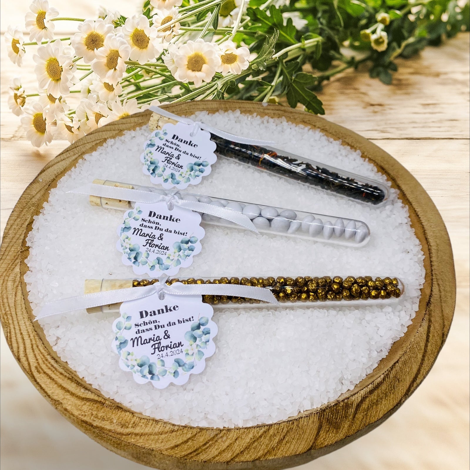 Entdecken Sie unser exklusives Gastgeschenk für die Hochzeit – ein elegantes Reagenzglas (160 mm x 16 mm), gefüllt mit einer Auswahl von 45 verschiedenen Inhalten siehe letzte Bilder.