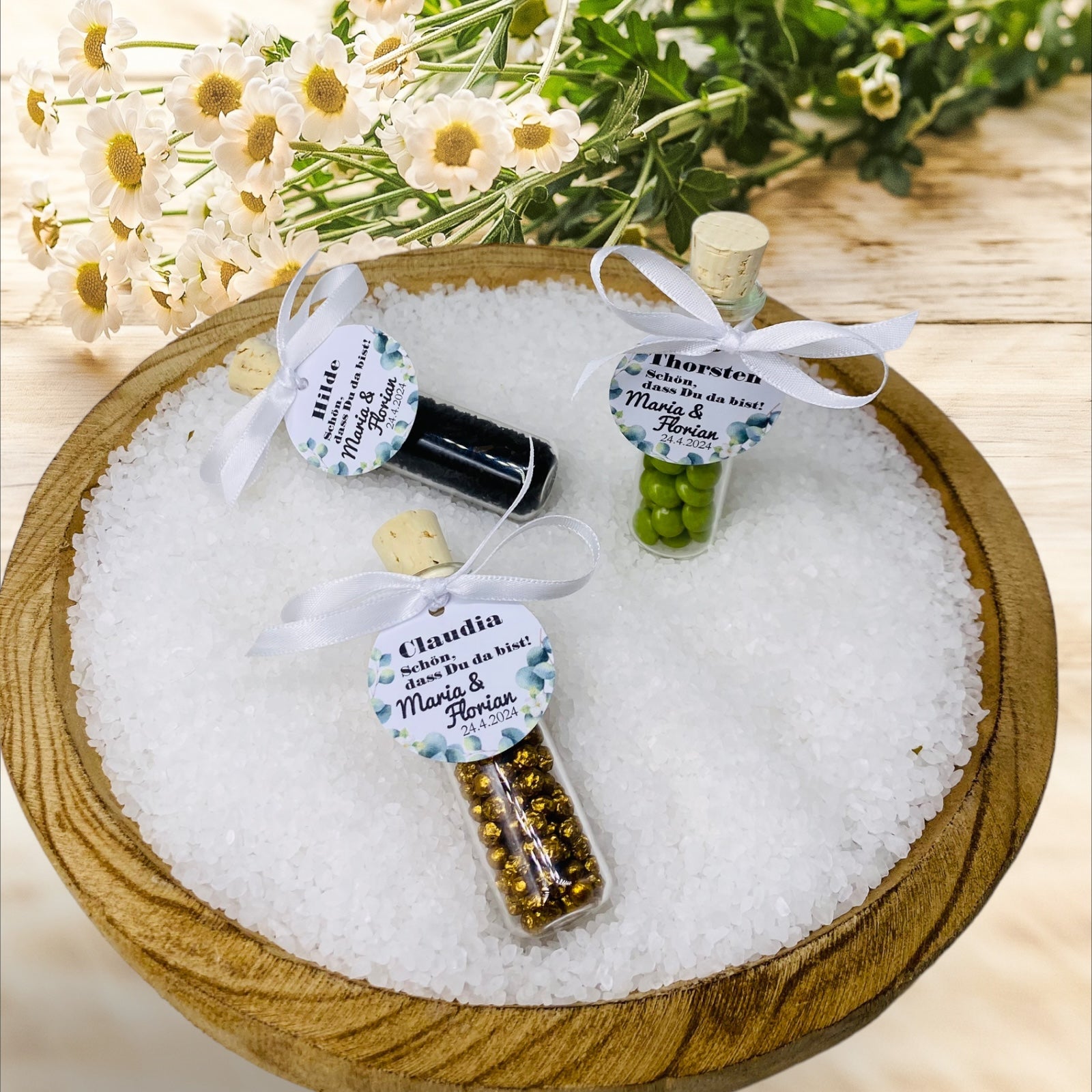 Entdecken Sie unser exquisites Gastgeschenk für Ihre Hochzeit – ein bezauberndes Schiffsgläschen (76 × 23 mm) aus Glas, kunstvoll verschlossen mit einem echten Korken. Das Gläschen ist mit einem von zehn verschiedenen Satinbändern geschmückt und gefüllt mit einer Auswahl aus 45 verschiedenen Inhalten: