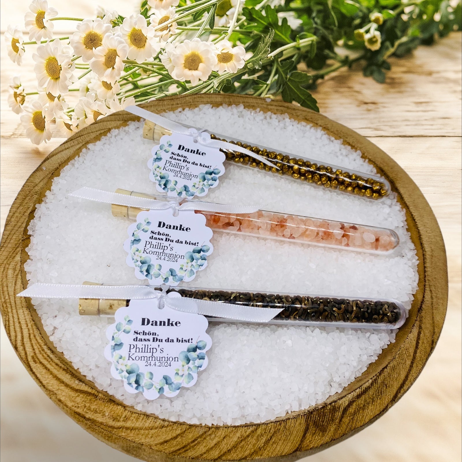 Jedes Reagenzglas ist mit einem Anhänger versehen, der mit dem Satinband befestigt ist. Auf dem Anhänger steht die herzliche Botschaft "Danke schön, dass du da bist", die nach Wunsch personalisiert werden kann – sei es mit einem allgemeinen "Schön, dass du da bist" oder einer spezifischen Anpassung für Namen und Datum. Ein persönliches und geschmackvolles Gastgeschenk, das Ihre Feierlichkeit unvergesslich macht.