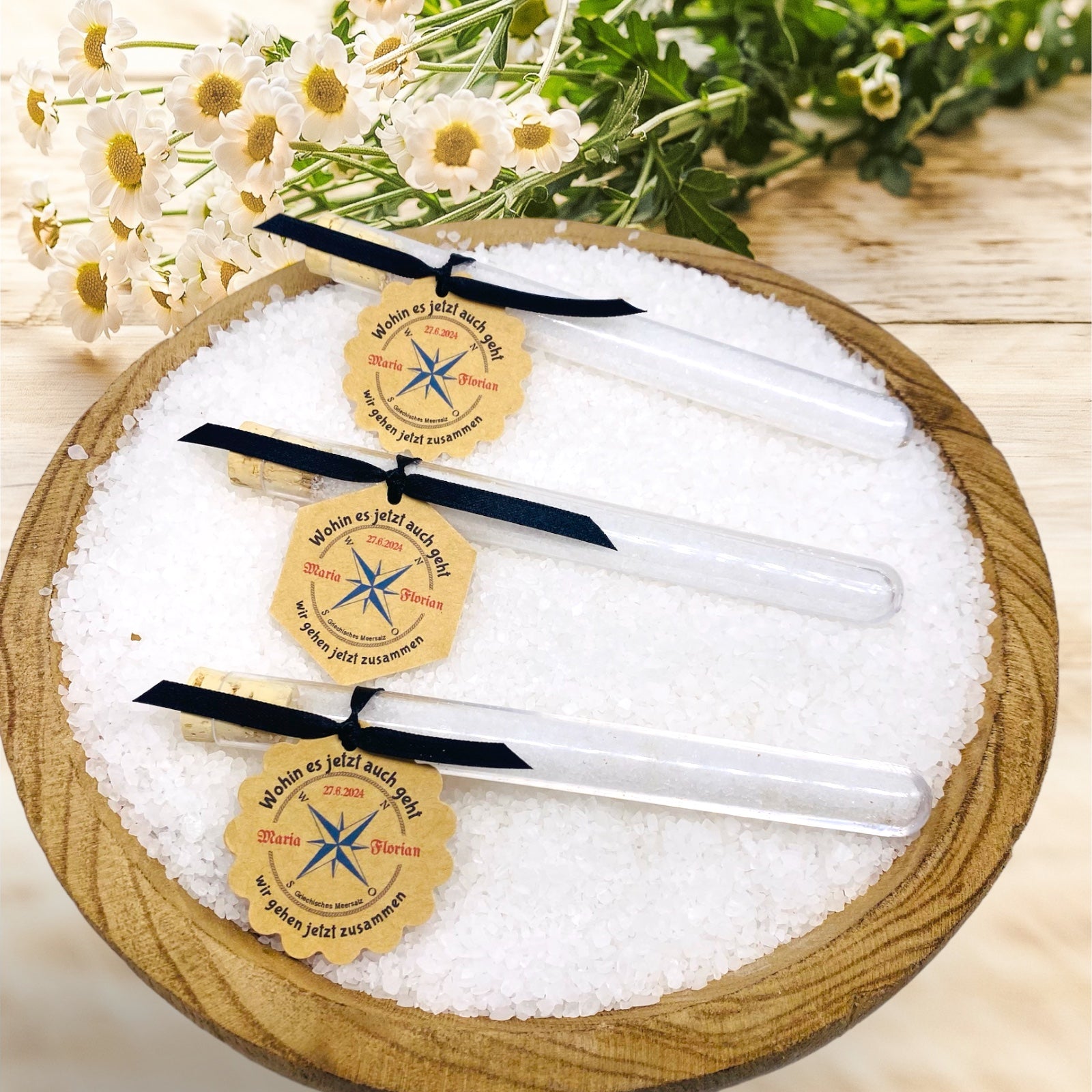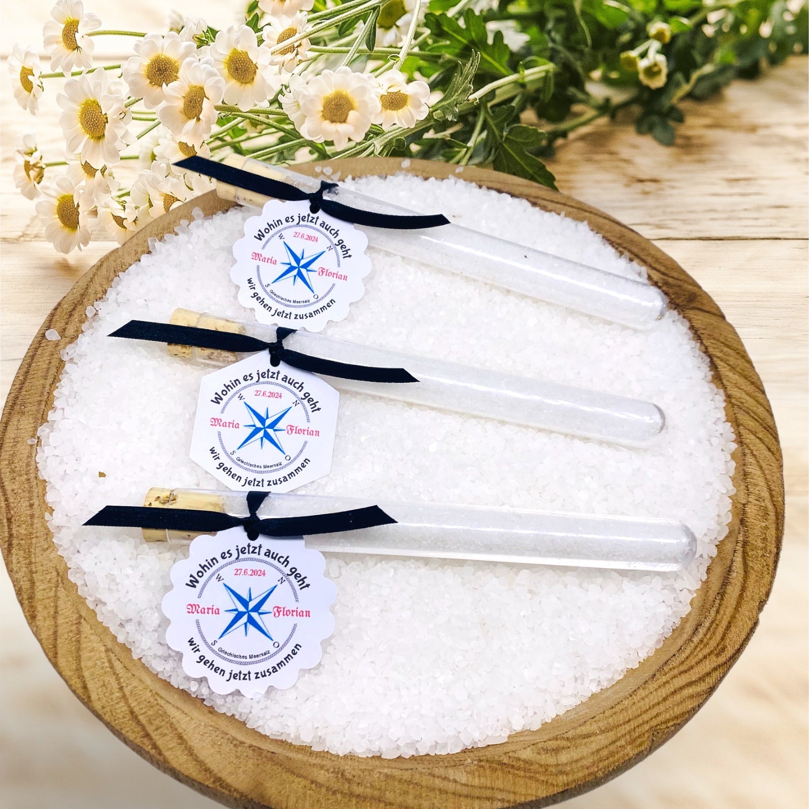 Verleihen Sie Ihrem besonderen Tag einen Hauch von Eleganz mit unseren einzigartigen Gastgeschenken zur Hochzeit. Unsere liebevoll gestalteten Reagenzglas (160 × 16 mm) enthalten feinstes griechisches Meersalz und sind mit einem maritimen Kompass verziert, der in alle Himmelsrichtungen weist. Personalisiert mit Namen und Datum, hinterlassen diese Geschenke einen bleibenden Eindruck. Der inspirierende Spruch "Wohin es auch jetzt auch geht, wir gehen jetzt zusammen, " symbolisiert den neuen Lebensweg des Paares. Eine Danksagung im Fairway-Stil für Ihre Gäste, die Ihre Liebe zum Detail schätzen.