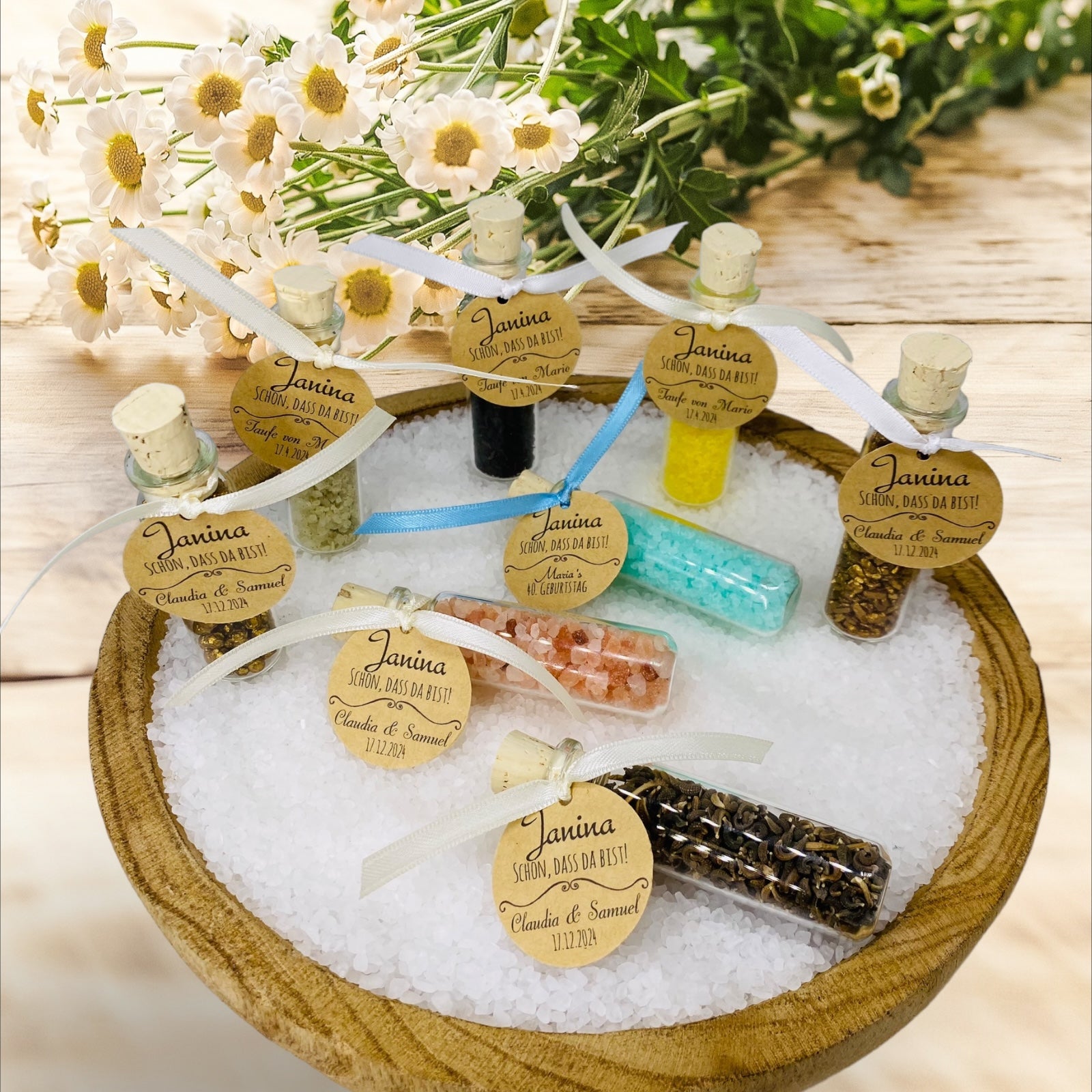 Discover our exquisite guest gifts that combine elegance and individuality. Our small glass bottles are filled with carefully selected fillings and offer a diverse selection to suit every taste. Each bottle not only serves as a tasteful gift, but also as a personalized place card - thanks to the included kraft paper tag.