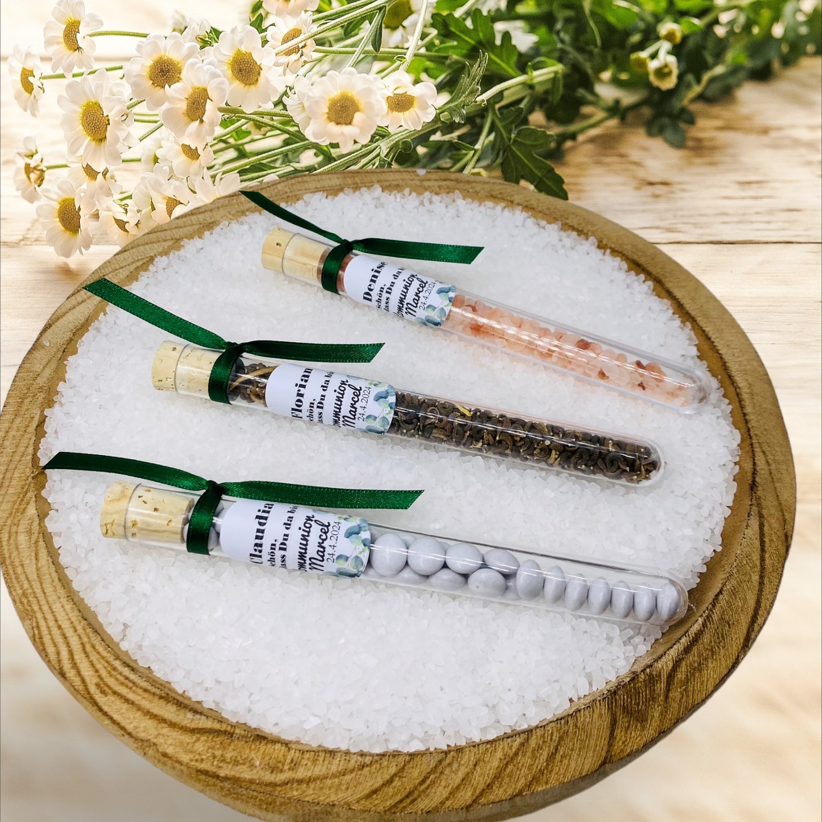 Entdecken Sie unser einzigartiges Gastgeschenk – ein liebevoll gestaltetes Reagenzglas (160 mm x 16 mm), verschlossen mit einem echten Korken. Gefüllt mit einer Auswahl aus 45 verschiedenen Inhalten, bietet dieses Geschenk eine besondere Vielfalt für Anlässe wie Kommunion, Konfirmation oder Taufe.