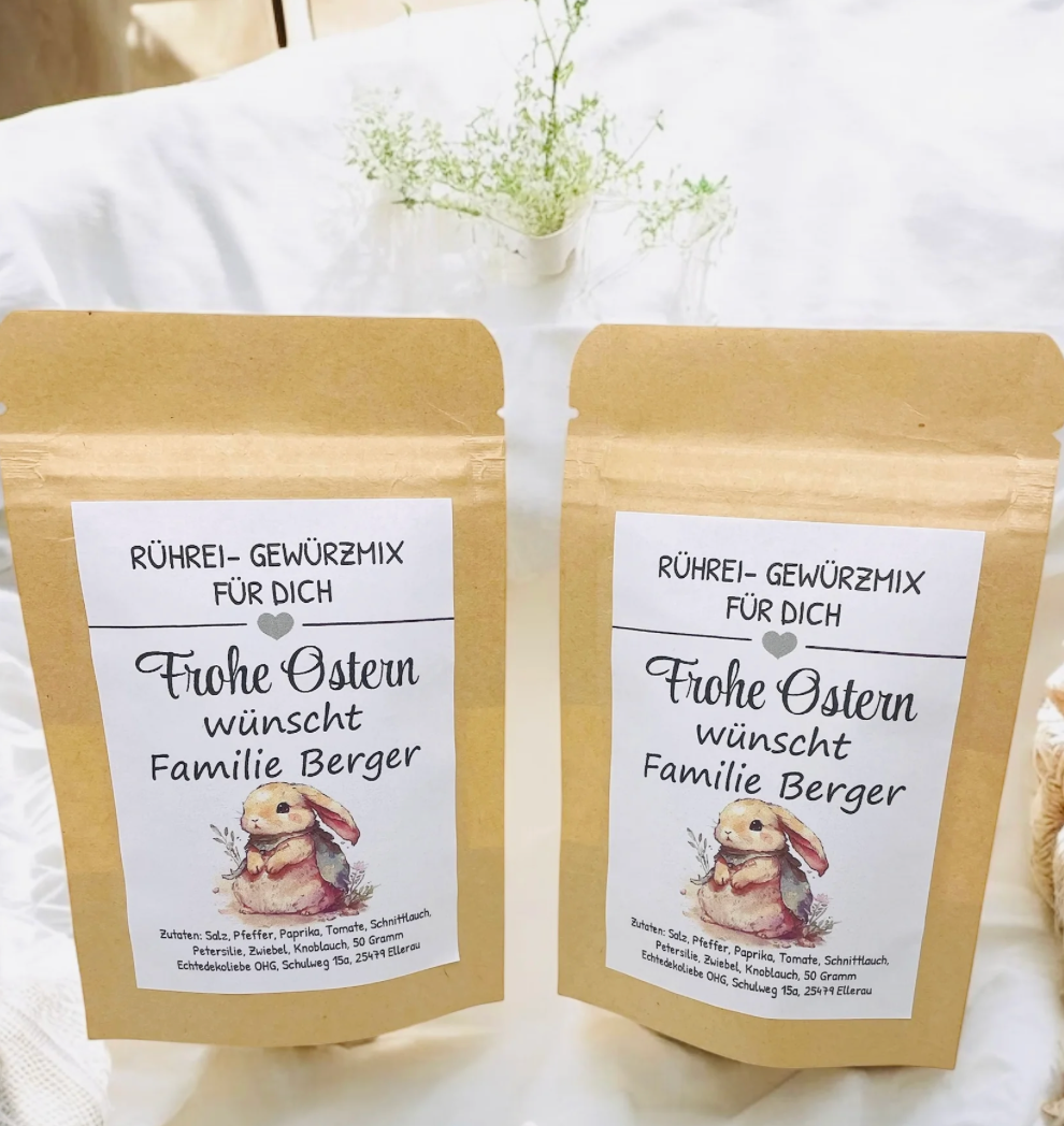 Auf den Tüten steht „Rührei-Gewürzmix für dich – Frohe Ostern wünscht …“, individuell personalisierbar mit dem Namen der Schenkenden.