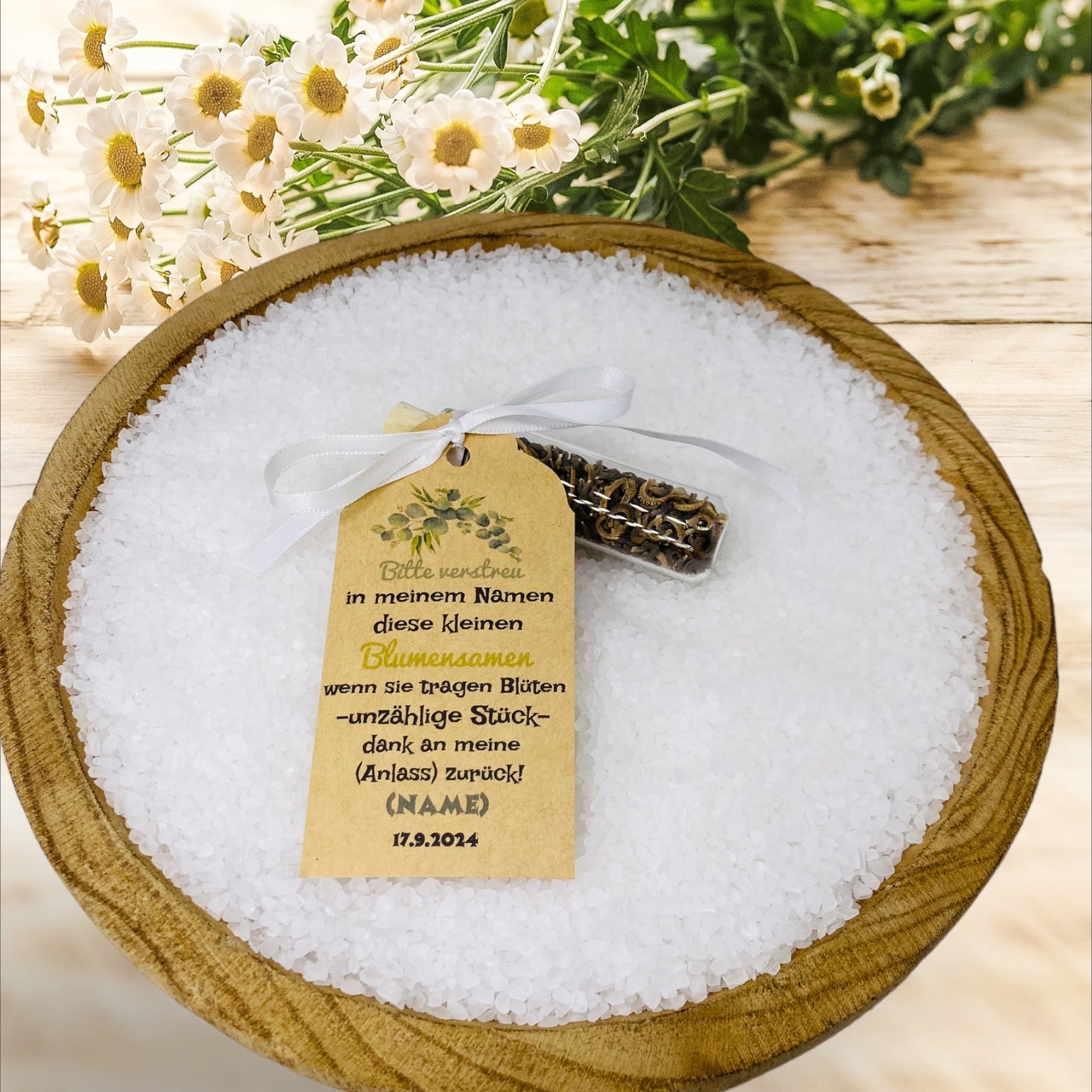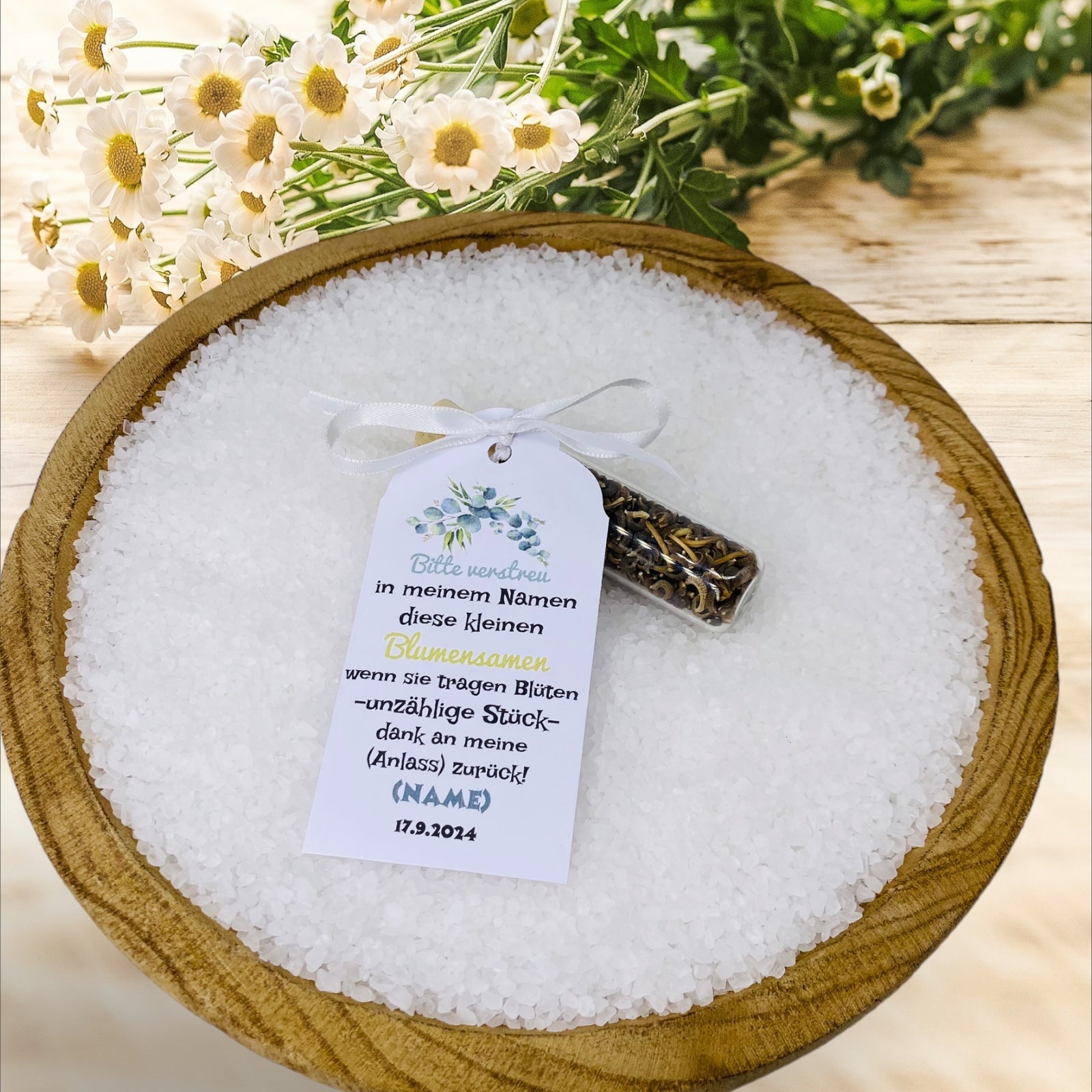 - **Großzügig geformter Anhänger:** Ein wunderschön geformter Anhänger schmückt das Band und trägt die bedeutungsvolle Inschrift: "Bitte verstreue in unserem Namen diese kleinen Blumensamen – wenn sie tragen Blüten, unzählige Stück denk an z.B. unsere Hochzeit, mein Geburtstag zurück.