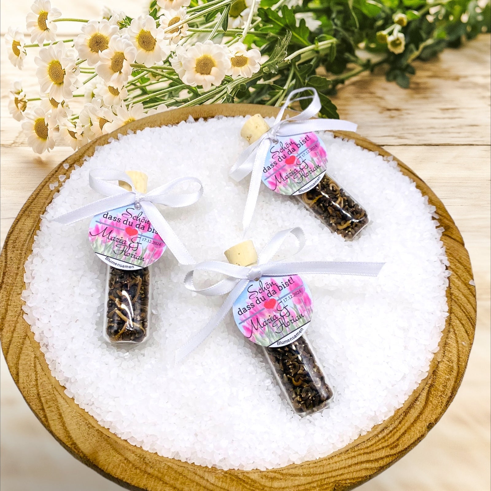 Überraschen Sie Ihre Gäste mit einem zauberhaften Gastgeschenk, das für bleibende Erinnerungen sorgt. Unser Schiffsgläschen-Geschenk ist gefüllt mit bunten Blumensamen, symbolisierend die Liebe, die wächst. Dekoriert mit einem individuell ausgewählten Satinband in verschiedenen Farben und verschlossen mit einem echten Korken, verleiht dieses einzigartige Präsent Ihrer Feier einen besonderen Charme.