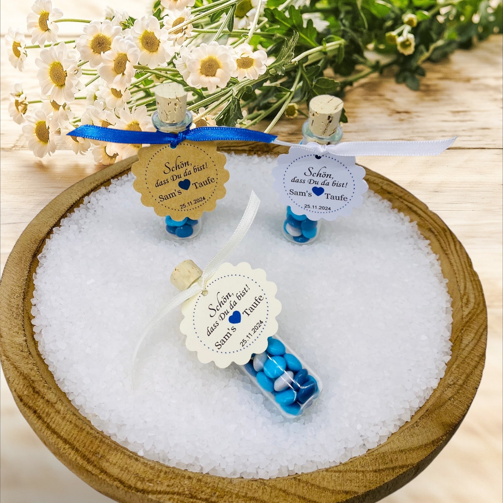 Zarte Liebe in jedem Detail: Personalisiertes Gastgeschenk für Jungen im Schiffsgläschen für unvergessliche Taufmomente